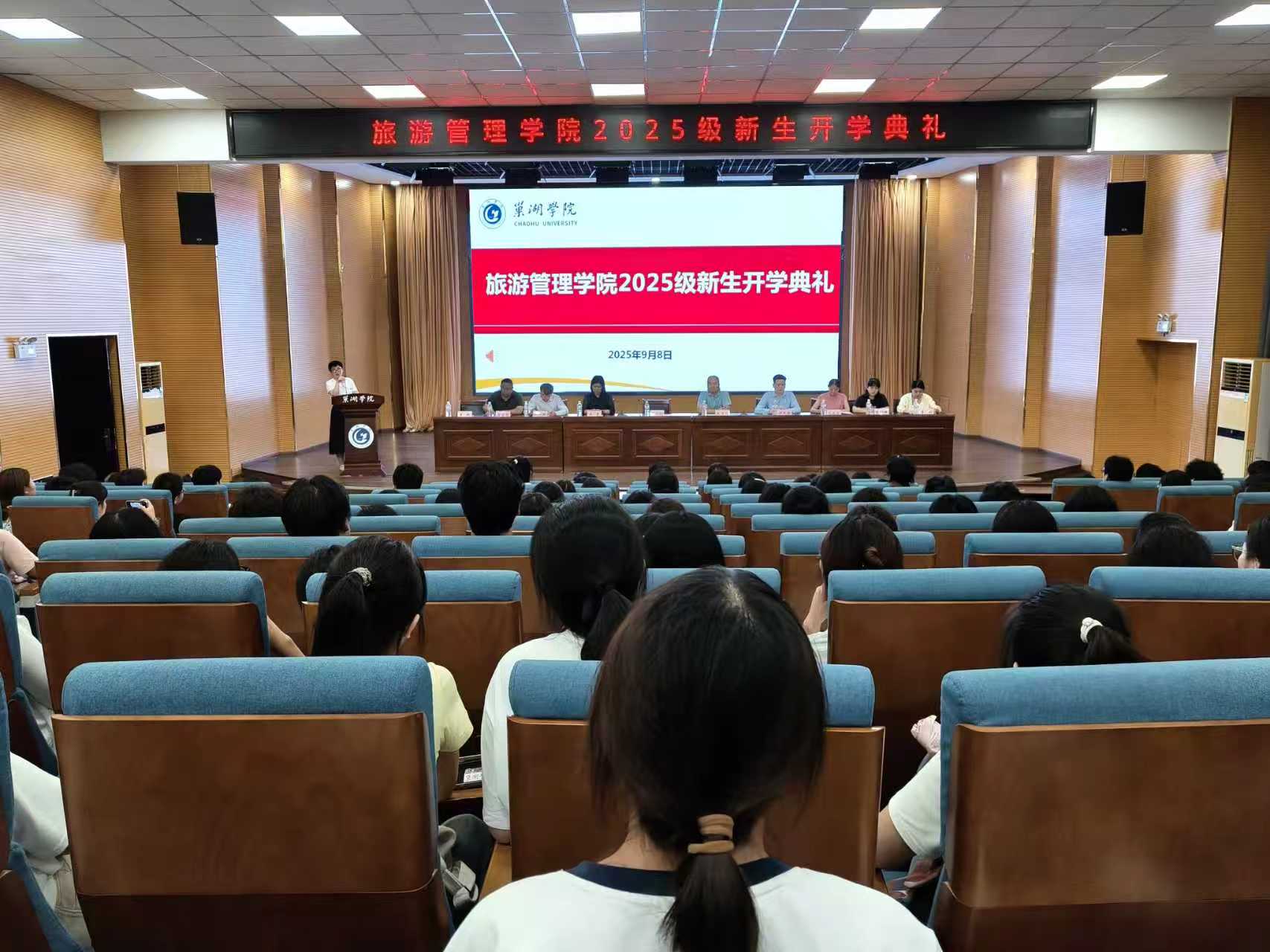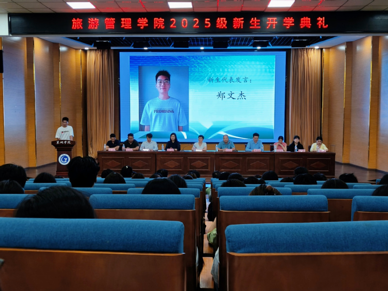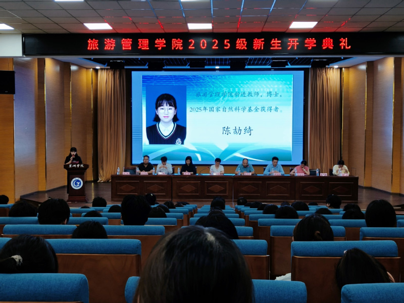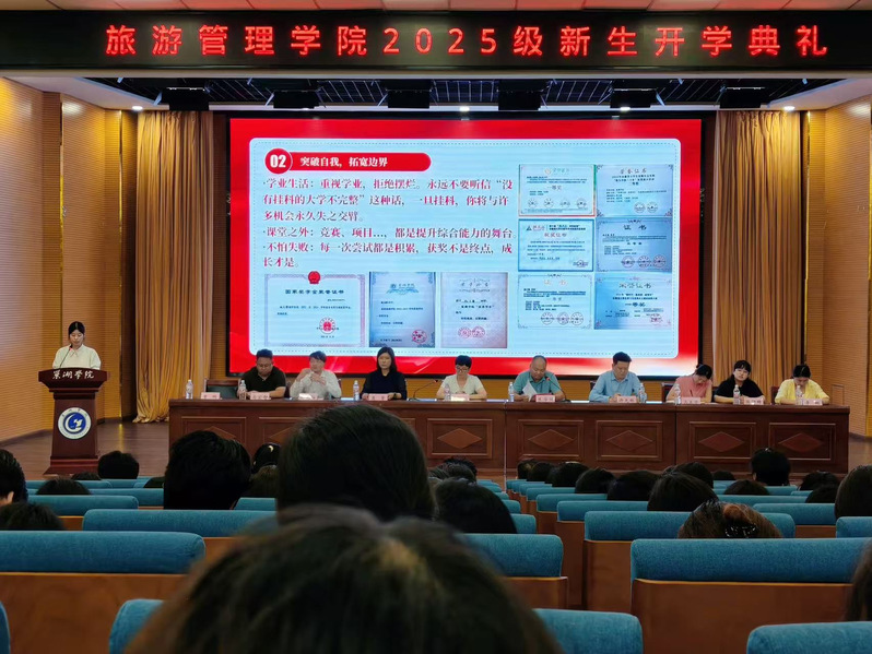 9月8日下午,旅游管理学院在求实楼报告厅举行2025级新生开学典礼。学院领导班子、教师代表、优秀校友、2025级辅导员及全体新生参加了典礼。典礼由学院副院长朱学同主持。