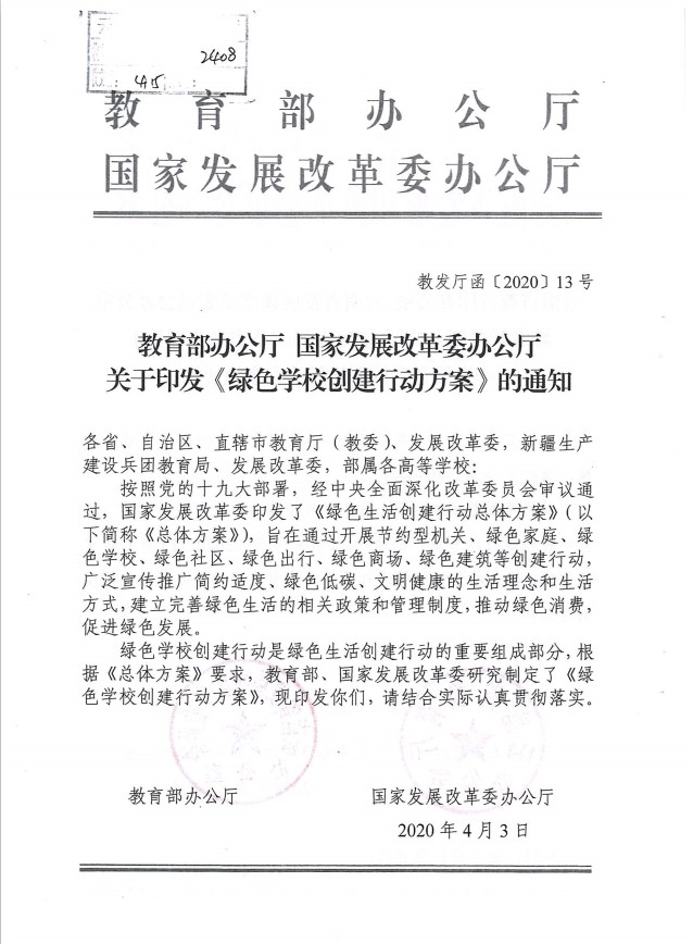 《教育部办公厅国家发展改革委办公厅关于印发<绿色学校创建行动方案>的通知》(教发厅函〔2020〕13 号)