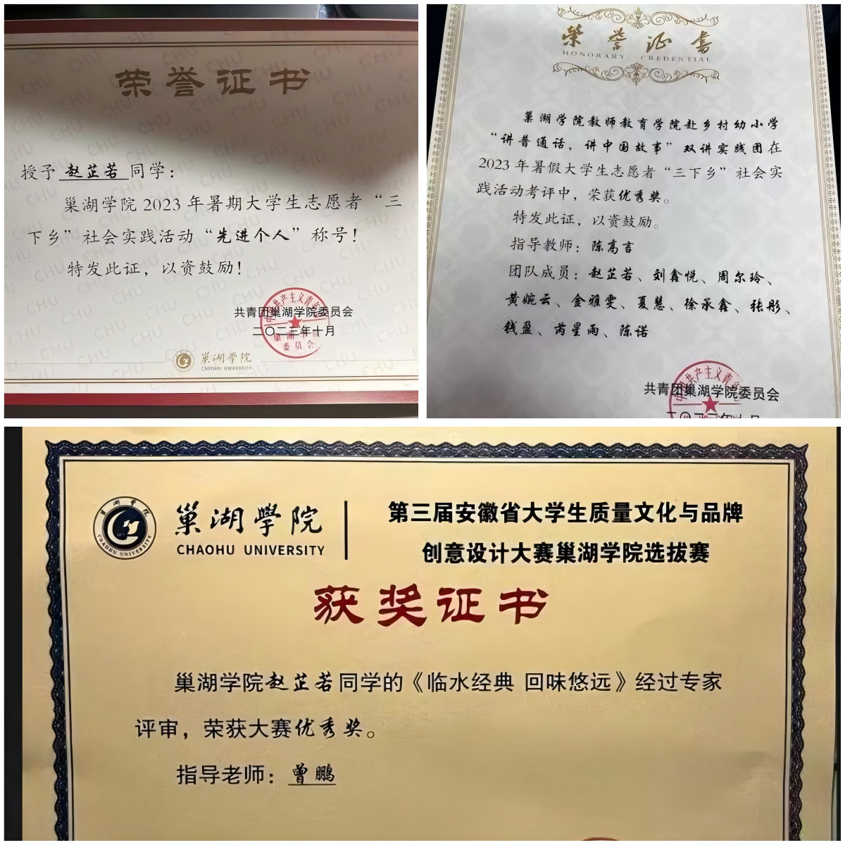 学业之余,赵芷若投身志愿服务与社会实践活动,把奉献写在乡野间。她带领团队入选“圆梦工程”志愿服务项目,深入农村传播文化助力未成年人成长且顺利结项,在暑期“三下乡”时深入乡村幼儿园推广普通话并调研教育困境提出优化路径,表现优异荣获“先进个人”称号,尽显其实践能力与奉献情怀。