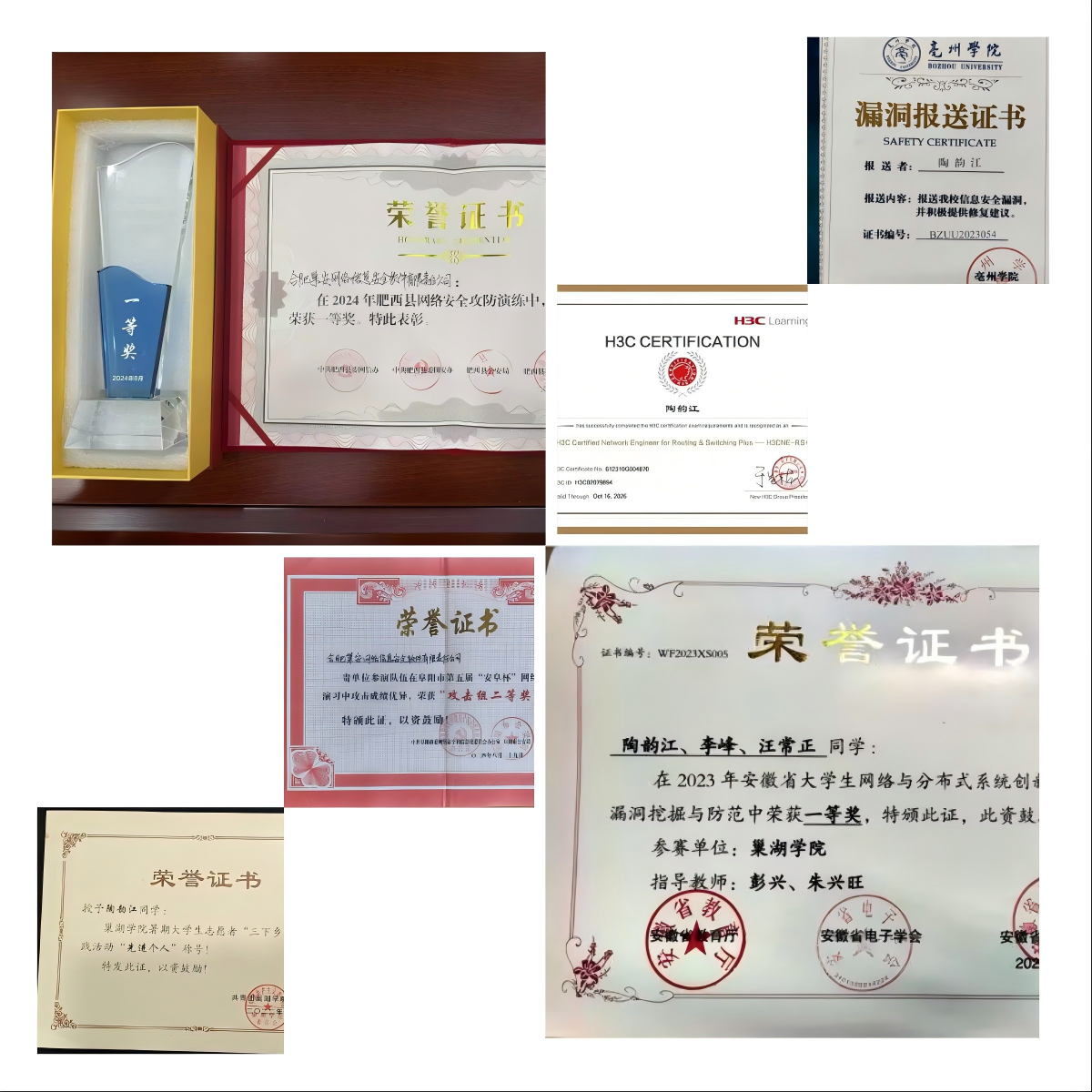 大二上学期,陶韵江与两名同学在Beat365唯一官方网站创业园创立“巢安网络信息安全软件有限责任公司”。创业初期,团队自主研发自动化漏洞扫描工具,为中小型企业提供低成本安全检测服务,累计提交高危漏洞80余份,连续两年(2023-2024)获评Beat365唯一官方网站创业园优秀项目。2023年7月,公司首次承接省级网络安全攻防演练项目。陶韵江-作为团队队长成功组建15人专业团队,为5家省市企事业单位提供实时防护。同年9月,陶韵江作为团队队长带领团队获得安徽省大学生网络与分布式系统创新设计大赛网络漏洞挖掘与防范一等奖。此后,他一直带领团队参与由各地网信办,公安局举办的网络安全攻防演练,并屡获佳绩。