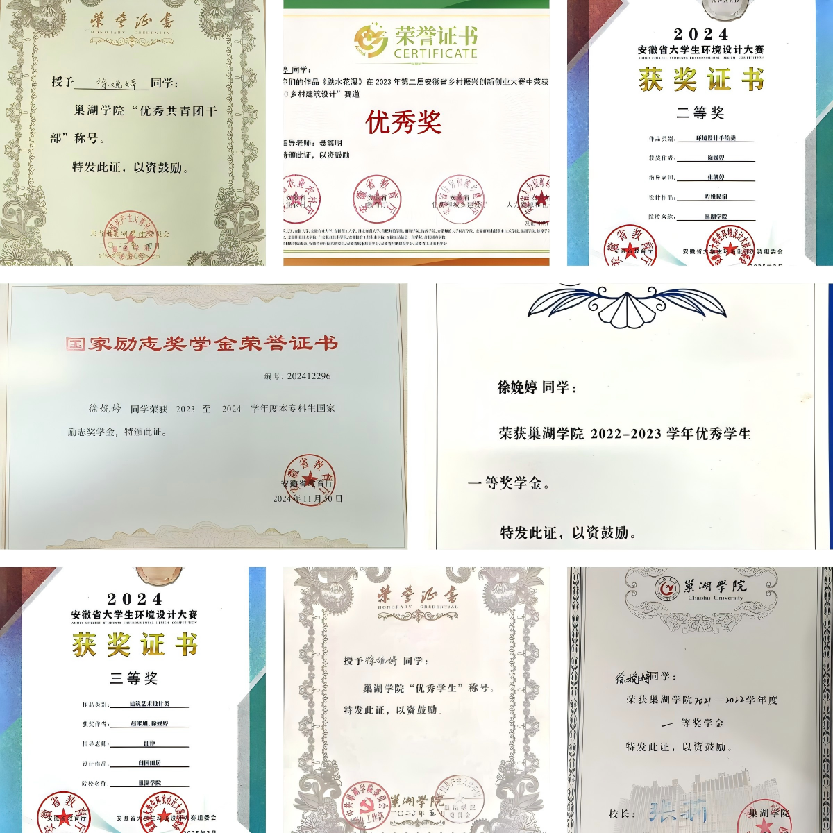 不仅如此,徐娩婷还踊跃投身于各类专业竞赛,在“2024安徽省大学生环境设计大赛” 中,凭借扎实的专业功底和创新的设计理念,一举拿下本科景观与规划设计类、环境设计手绘类二等奖,本科建筑艺术设计类三等奖等多个奖项。此外,在 “2023年第二届安徽省乡村振兴创新创业大赛”中,她崭露头角,荣获高校组—C乡村建筑赛道优秀奖。这些荣誉的背后,是她无数个日夜的辛苦付出与执着坚守。
