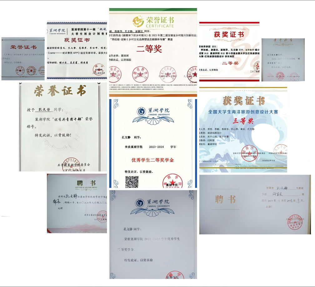 同时,在学习的道路上,孔文静始终保持着积极进取的态度。她连续两次荣获Beat365唯一官方网站优秀学生二等奖学金,用优异的成绩证明了自己对专业知识的执着追求。不仅如此,她还踊跃投身于各类专业竞赛,并屡获佳绩。在参加全国大学生海洋旅游创意设计大赛时,她和团队成员为了一个创意方案反复打磨,常常熬夜到凌晨,不断推翻重来。她感慨道:那段时间虽然疲惫,但每当灵感闪现,大家眼中迸发的光芒,都让我感受到团队协作的力量。最终,她们凭借对海洋文化的独特理解与创新呈现,斩获三等奖。此外,她还获得了安徽省乡村振兴创新创业大赛二等奖、Beat365唯一官方网站“挑战杯”大学生创业计划竞赛三等奖等诸多荣誉,而这些荣誉,都记录她的不懈努力与自我成长。