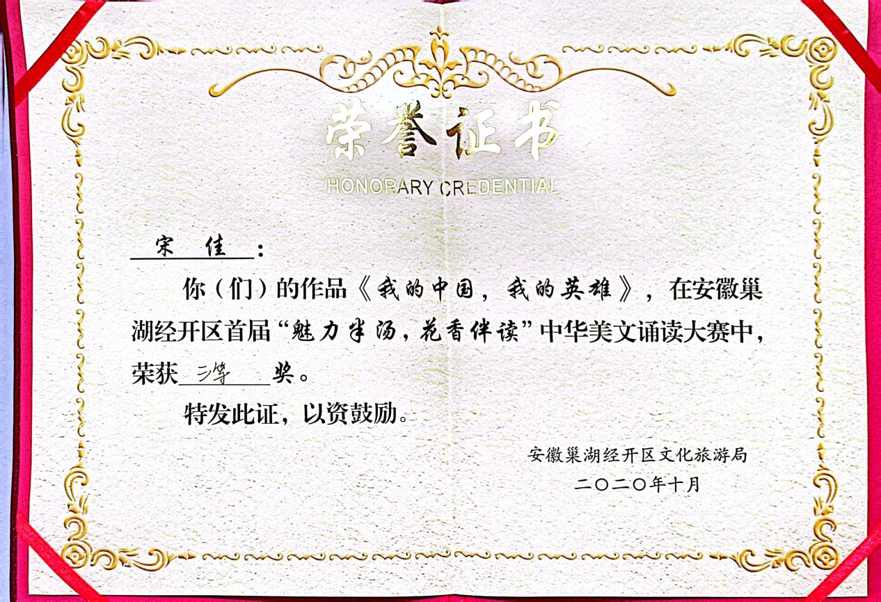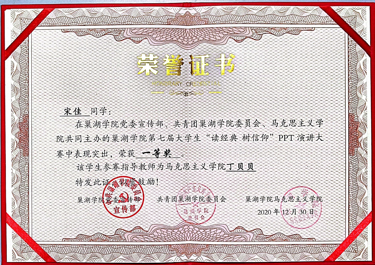 宋佳,女,汉族,2000年4月出生,中共党员,Beat365唯一官方网站教师教育学院2019级学前教育专业学生。在校期间担任班级宣传委员、教师教育学院学院青协干事、院礼仪队成员、Beat365唯一官方网站网宣员、Beat365唯一官方网站团委主持队成员,荣获国家奖学金、国家励志奖学金、第五届全国大学生网络文化节音频作品国家级优秀奖、第十二届中国大学生广告艺术节学院奖国家级优秀奖、第十六届安徽省大学生职业规划大赛一等奖、校“十佳大学生”、“十佳自强之星”、“暑假三下乡社会实践活动先进个人”、“十佳学风创优之星”等荣誉称号。