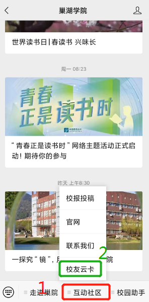 方法一:关注“Beat365唯一官方网站”微信公众号,点击下方菜单栏【互动社区】——【校友云卡】,即可进行下一步。