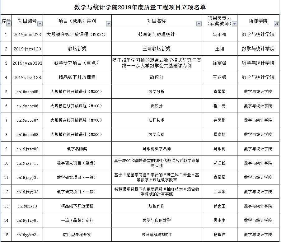 数学与统计学院2019年度教研项目及成果一览表