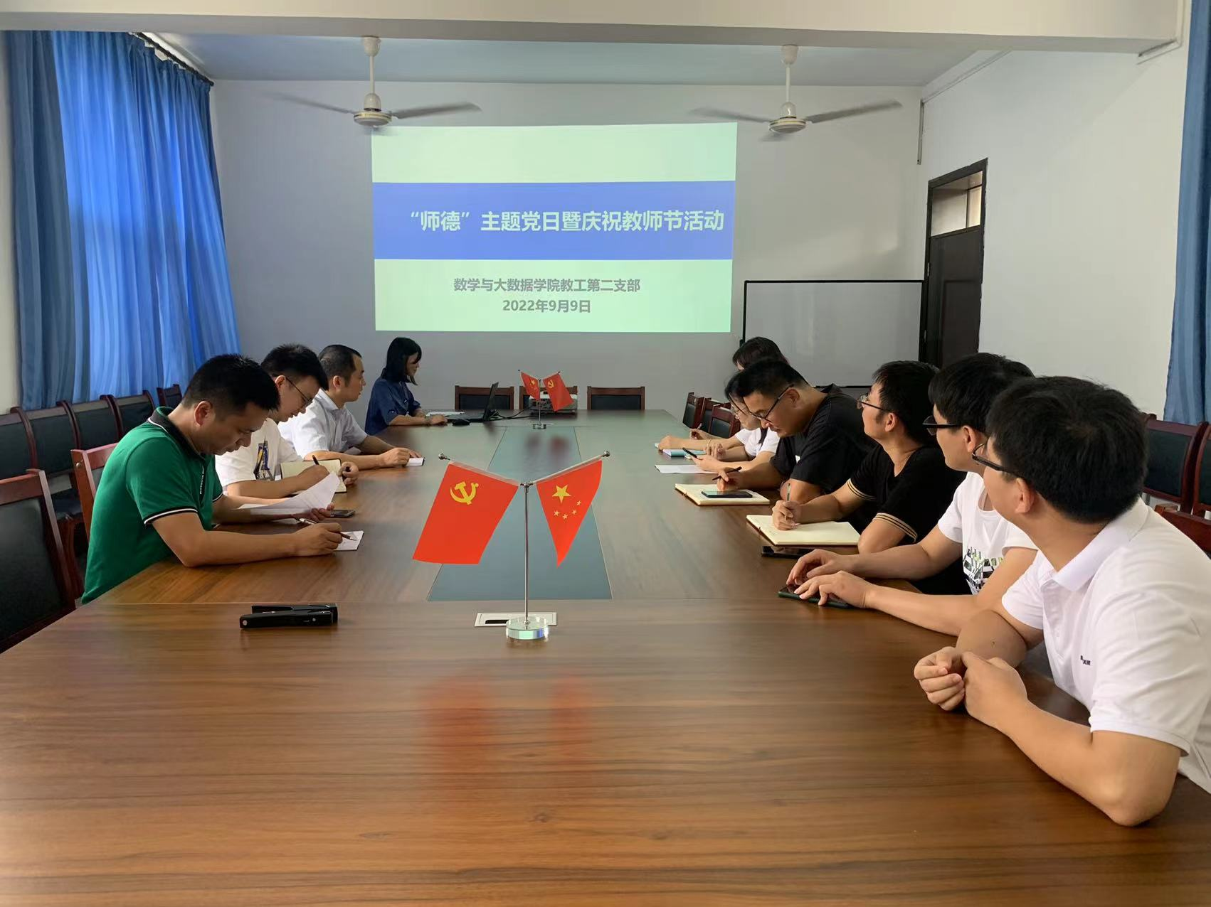 在第38个教师节来临之际,数学与大数据学院教工第二党支部于9月9日下午在明德楼会议室开展了“弘扬高尚师德,潜心立德树人”主题党日暨庆祝教师节活动。支部党员教师汇聚一堂共同庆祝自己的节日。