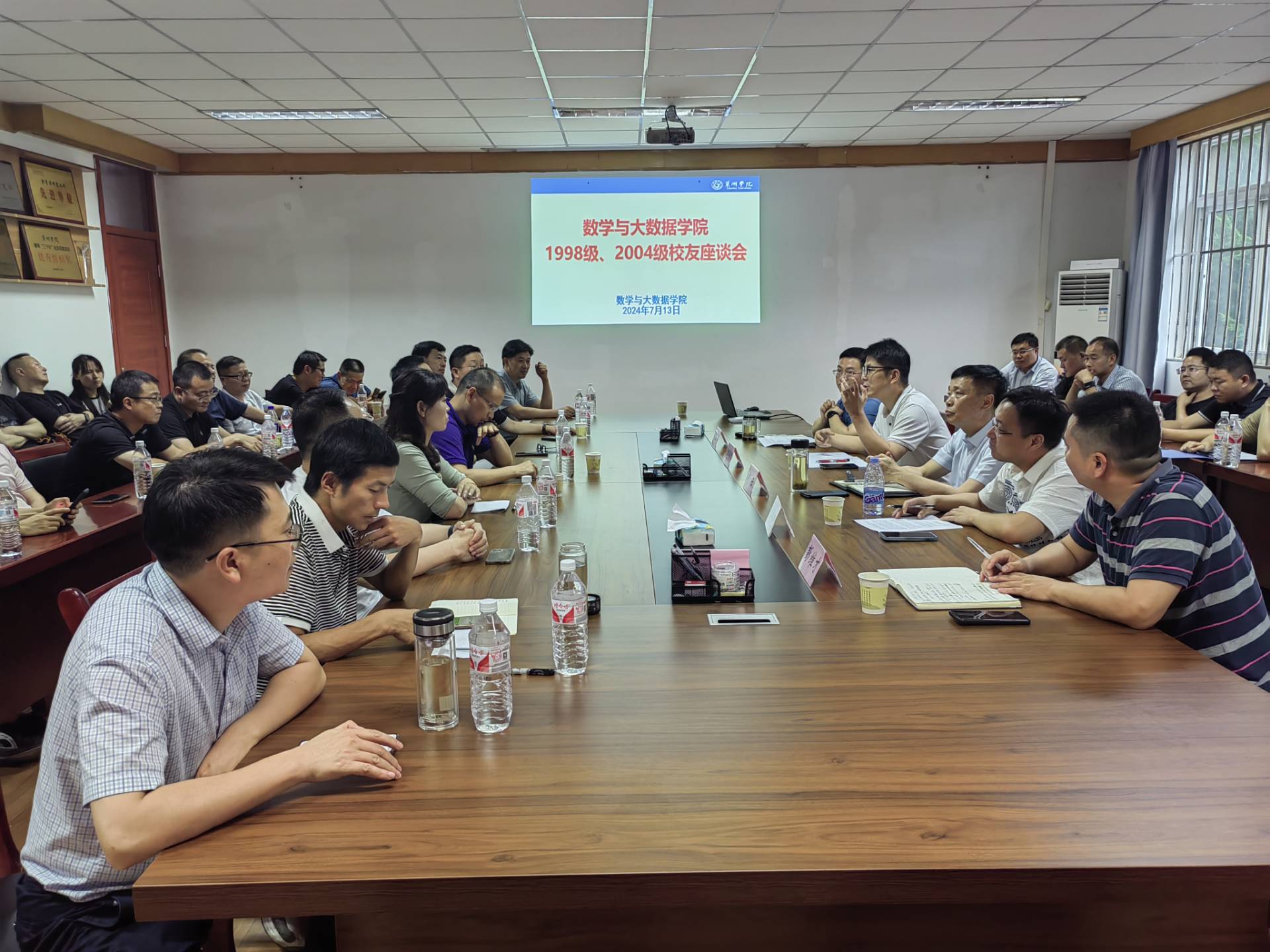 数十载同窗聚首,忆芳华岁月如歌。数学与大数据学院1998级数学教育与2004级数学与应用数学专业部分校友于7月13日共同返校,并于当日下午14:00在笃行楼会议室举办校友座谈会。数学与大数据学院副院长陈佩树、彭维才,校友办副主任郑向阳,1998级数学教育专业班主任、原数学系系主任钱云应邀参加,本次座谈会由学院党委副书记郝江锋主持。