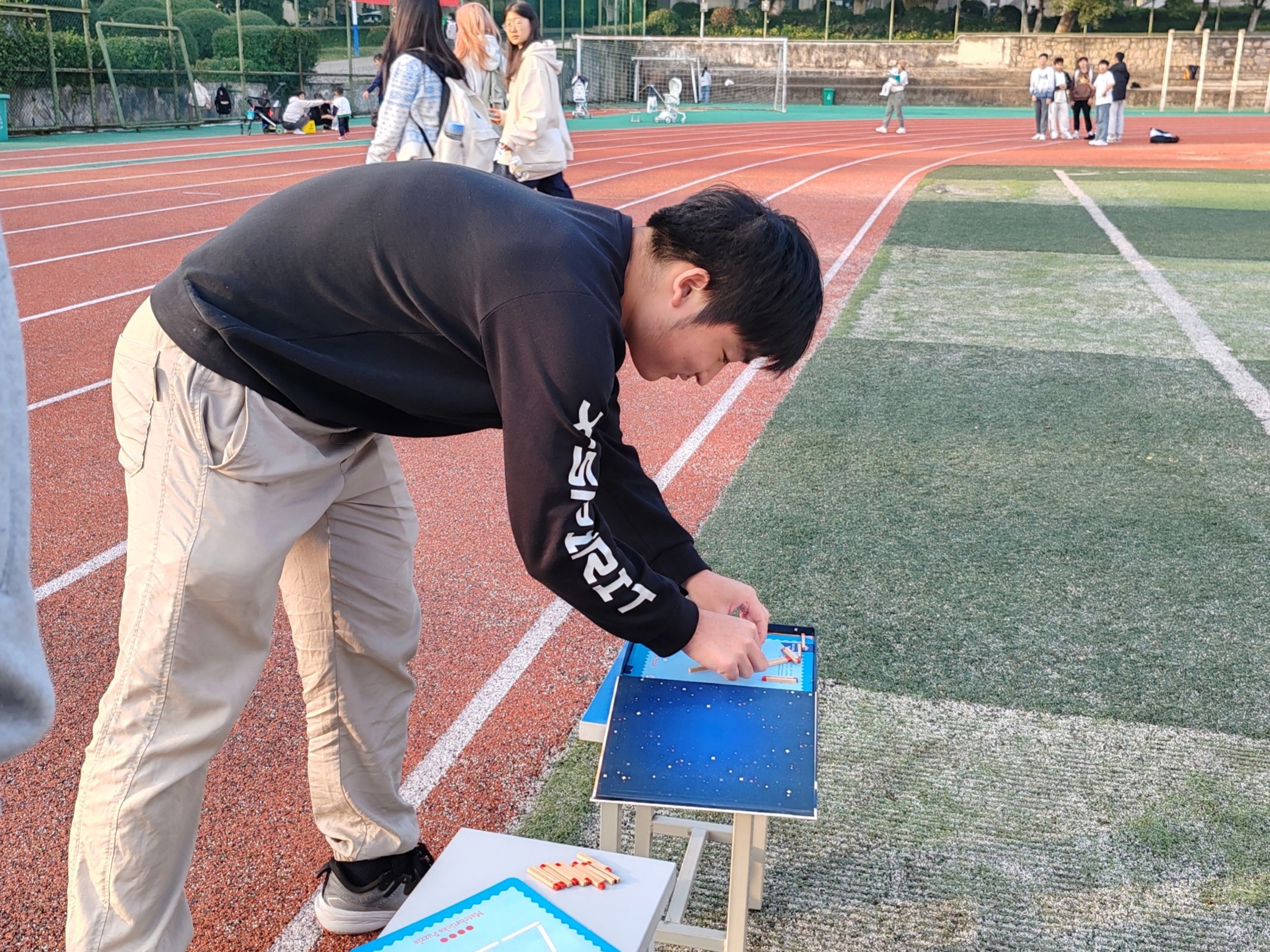 趣味运动会分为个人赛和团体赛。个人赛包括“趣味数学”和“无穷乐趣”两个子活动,每人完成两道展台张贴的趣味数学题目,再用固定软件在规定时间内,完成以展台为中心交点的数学“Ω”形图案。团体赛三人一组,以接力的形式完成火柴组装。现场活动气氛热烈,参赛的同学们脸上洋溢着兴奋和期待,数学知识与体育运动的有机融合,体力与脑力激情碰撞,让每位参赛同学都感觉兴致勃勃、意犹未尽。