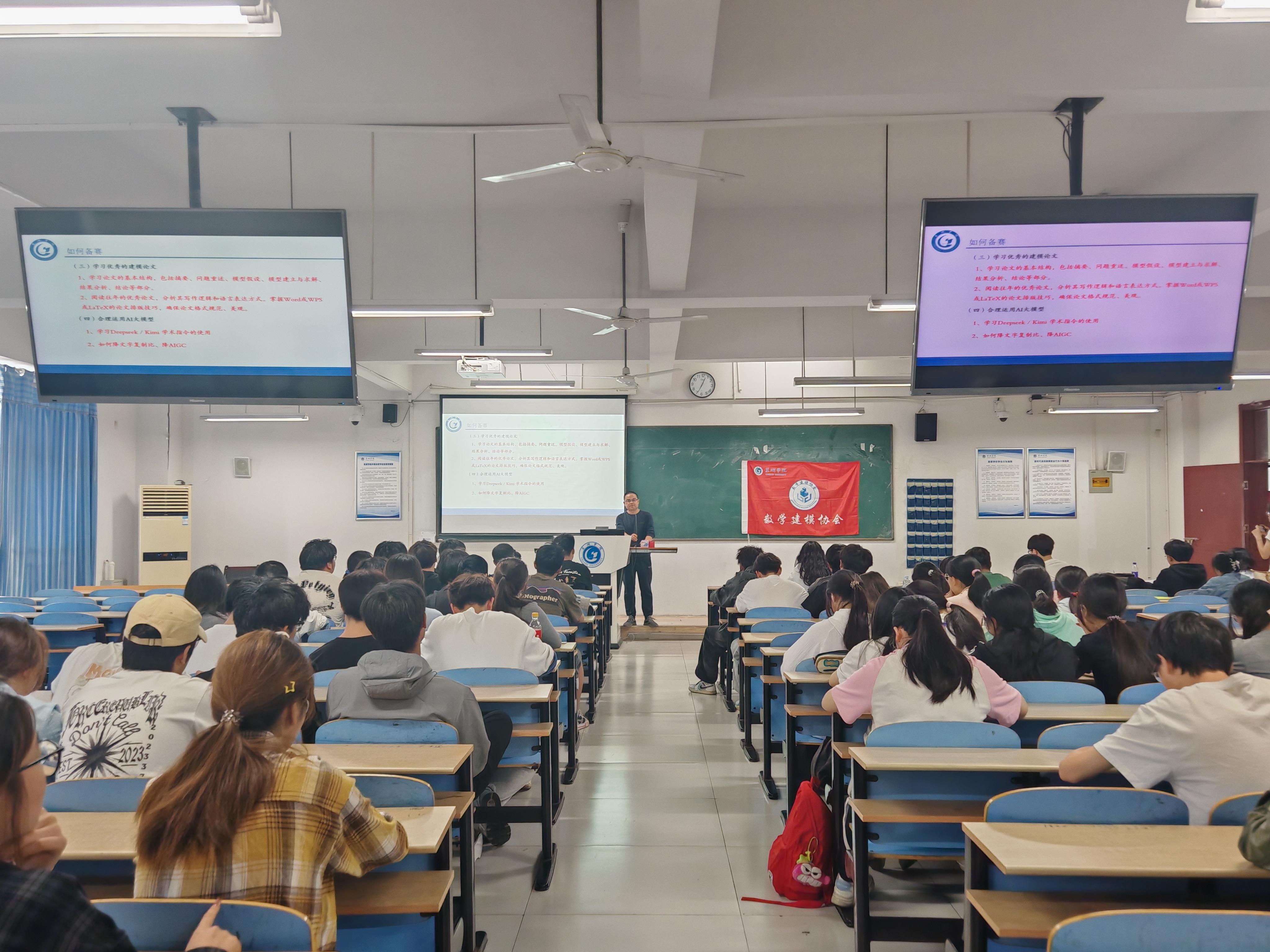 徐富强从论文写作规范切入,强调建模论文需逻辑严谨、结构清晰,合理利用AI工具辅助图表生成与语言优化,同时严守学术诚信底线,确保模型推导的原创性。三位高年级国奖得主结合实战经验,分别围绕团队分工、选题策略与备赛心态展开分享,提出“建模手-编程手-论文手”协作模式,建议通过模拟赛磨合流程、积累代码库与术语库,并鼓励以赛促学提升综合竞争力。