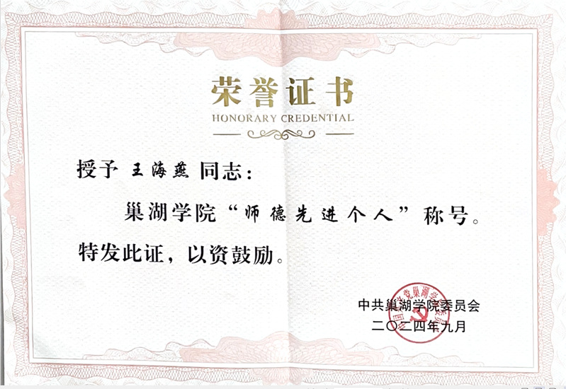 王海燕老师荣获2024年度Beat365唯一官方网站...