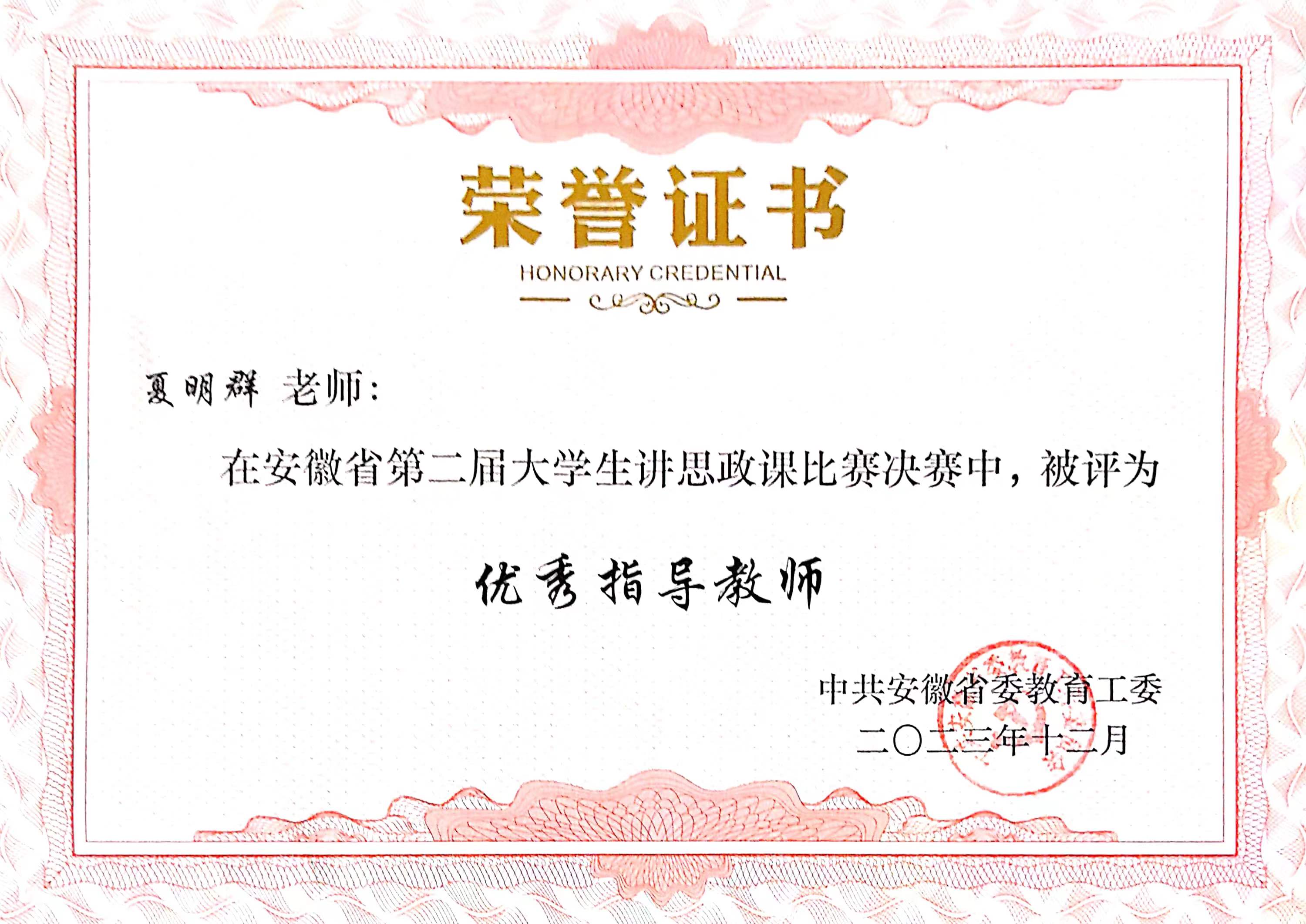 夏明群在指导“安徽省第二届大学生讲思政课”比赛中荣获优秀指导教师