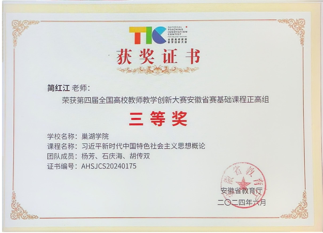 简红江教师在“第四届全国高校教师教学创新大赛安徽省赛”中荣获三等奖