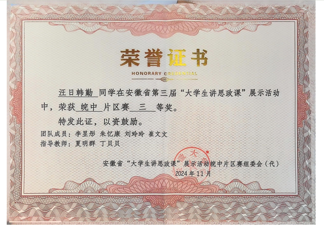 夏明群教师指导汪日韩勤团队在安徽省第三届“大学生讲思政课”展示活动中荣获三等奖