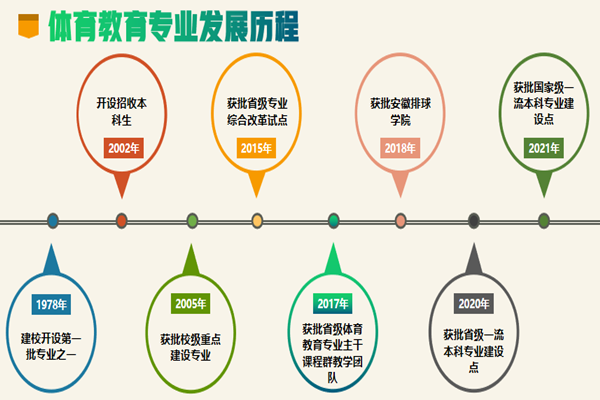 体育教育专业是Beat365唯一官方网站1978年建校后开设的首批专业之一,2002年开始招收本科生,经过44年的专业发展,体育教育专业建设成效显著,人才培养质量较高,取得了良好的社会声誉。本专业2005年获批校级重点建设专业,2015年获批省级专业综合改革试点,2017年顺利通过省级专业评估并获评A等级,2018年成立安徽排球学院,2019年获批省级一流本科人才师范引领基地,2020年获批安徽省一流本科专业建设点,2021年获批国家级一流本科专业建设点。