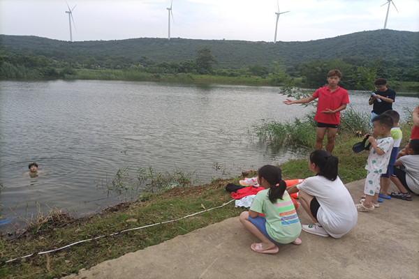 为加深小朋友们的印象,实践团因地制宜,通过启发引导和现场模拟使得小朋友们对溺水自救知识有了更生动的了解。讲解员:“有没有哪位小朋友知道,当人落水时的第一反应动作是什么?”小朋友A:“拼命地挣扎,非常地慌张,害怕呛水。”讲解员:“对!但是我们如果这样能不能让自己获救?”小朋友们:“好像不能。”讲解员:“没错,拼命挣扎,上下扑腾,这种姿势只会消耗大量体力,还有继续下沉的危险。”说着实操员王旭跳入水塘,现场演示落水后高举双手等错误的自救方式,小朋友们发现这样做反而会使身体沉得更快。“那我们该怎么办啊?”岸边宣讲员金柱解释道:“我们可以运用仰漂的方法施行自救,这样需要的力气小,可以节省体力。小朋友们仔细看水塘里哥哥做的正确溺水自救方法。大家要身体往后仰,把嘴巴和鼻子露出水面,慢慢地吸气呼气……”