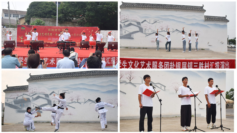 为更好地实现党建带动团建,体育学院成立文化艺术服务团专项领导小组,全面统筹文化艺术服务团暑期社会实践工作,积极吸纳、选派以17名优秀党员和团学骨干为主力的40名团员青年投入服务团工作中,让党组织的政治优势和党员的模范作用转化为引领青年社会实践的重要推动力。经过一个多月的充分准备,服务团青年学子紧密结合专业特点与自身特长,秉承学校、学院优良传统,精心编排、演绎了符合新时代主旋律、贴近基层生活实际的民族打击乐、体育舞蹈、拉丁舞、跆拳道、啦啦操、红歌、朗诵等多个节目,演出内容丰富、精彩纷呈,演出现场人声鼎沸,村民兴致高昂,文艺汇演受到父老乡亲的热烈欢迎与倾力支持。