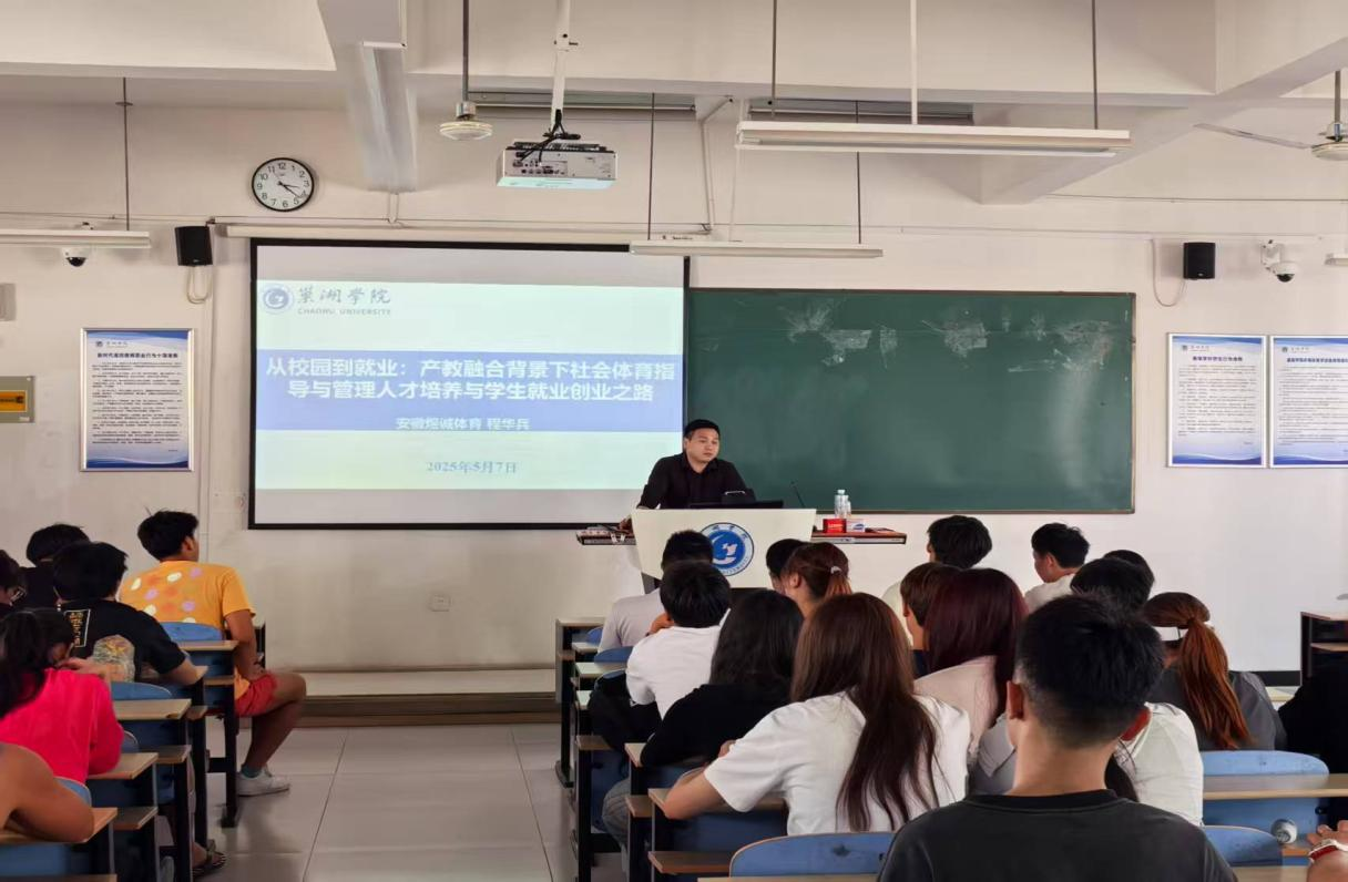 2025年5月7日下午,社会体育指导与管理系举办了一场主题为“从校园到就业:产教融合背景下社会体育指导与管理专业人才培养与学生就业创业之路”的企业导师讲座。本次讲座邀请了2016届优秀毕业生、安徽煜诚体育健身有限公司董事长程华兵作为主讲嘉宾。会议由苏家本主持,全体2024级社会体育指导与管理专业学生参会。