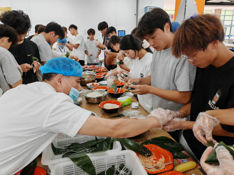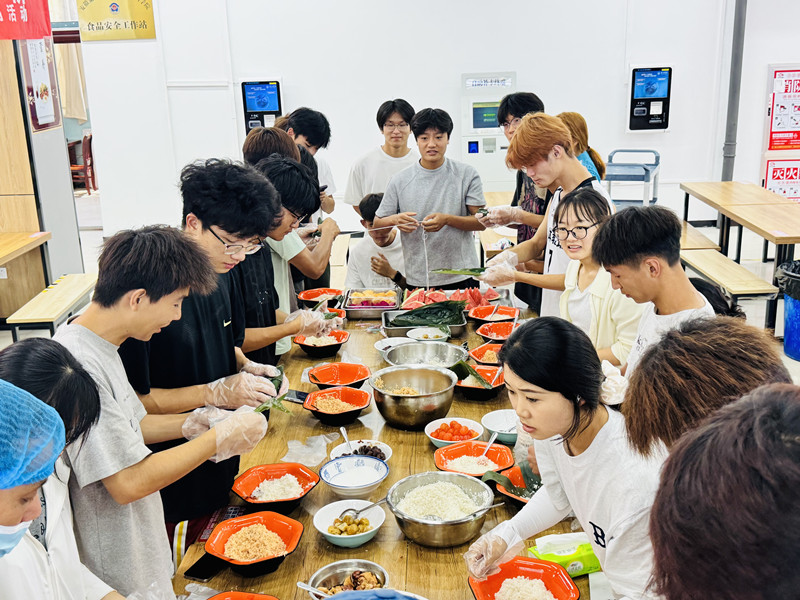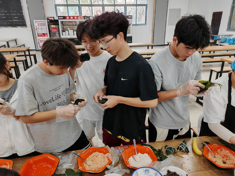 活动现场,学生早早准备好了糯米、粽叶、红枣、红豆等食材,学生党员和团员们围在一起,纷纷动手尝试包粽子。大家有的手法熟练,迅速将粽叶卷成漏斗状,填入糯米和馅料,再用棉线紧紧捆扎;有的则是第一次包粽子,略显笨拙,在食堂工作人员的耐心指导下,逐渐掌握了技巧。折叶、填米、包裹、捆绳,一个个形态各异的粽子在大家的手中诞生。