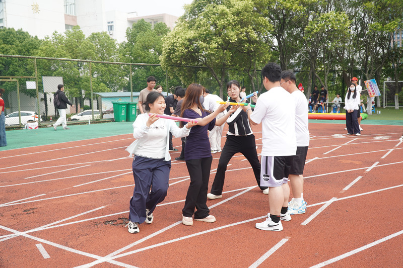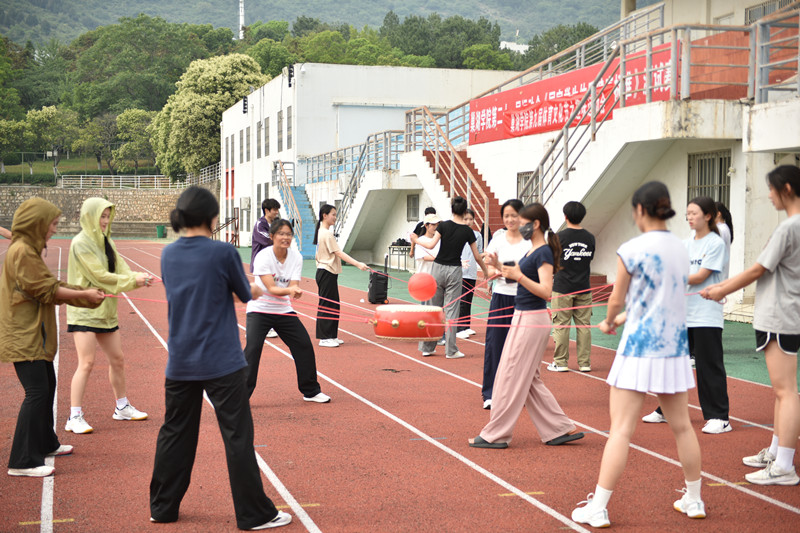 随着一声哨响,比赛正式拉开帷幕。“疯狂毛毛虫”项目中,队员们跨坐在充气道具上,齐声喊着口号,步伐一致地向前冲刺,宛如一条条灵动的彩龙在赛场上飞驰;“珠行万里”考验着团队的默契与协作,选手们手持U型槽,小心翼翼地传递小球,全神贯注的神情与紧密配合的动作令人赞叹;“一圈到底”环节,队员们手拉手,灵活地扭动身躯,让呼啦圈在团队中快速传递,现场加油声此起彼伏;“同心击鼓”最具挑战性,众人合力牵拉鼓绳,通过调整力度与节奏,让鼓面精准接住不断落下的排球,每一次成功击球都引发阵阵欢呼。赛场上,各学院代表队默契配合、奋勇争先,将智慧与力量完美融合;赛场边,观众热情高涨,呐喊助威声、欢笑声交织成一片欢乐的海洋。比赛结束后,工作人员迅速投入到场地清理工作中,他们分工明确、高效协作,很快让操场恢复整洁有序。