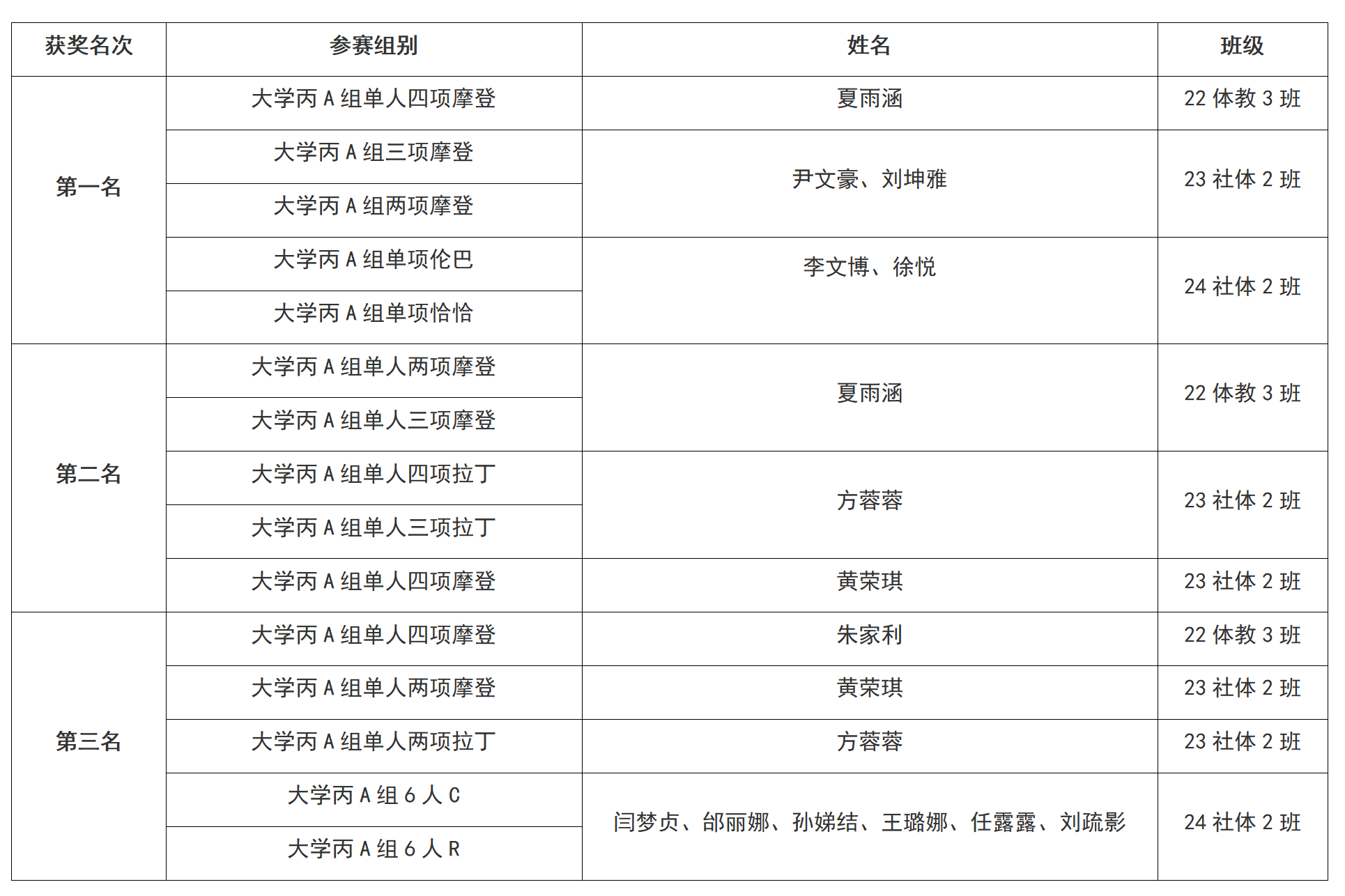 我校派出以丁源源、张斌老师为教练,夏雨涵、朱家利、尹文豪、刘坤雅、方蓉蓉、黄荣琪、李文博、徐悦、孙娣结、刘疏影、邰丽娜、闫梦贞、任露露、王璐娜等14名同学组成的体育舞蹈代表队,参加了此次比赛,经过为期三天的预赛、复赛、半决赛、决赛的角逐和晋级,最终斩获5金(第1名),5银(第2名),5铜(第3名),8个组别的第4-8名的优异成绩,共计一等奖15个,二等奖7个,三等奖1个,是继2023、2024年之后,连续三年蝉联团体总分全国排名第三名(省内最好成绩)、中国大学生体育舞蹈锦标赛“丙A组”的团体总分和金牌榜第一名。同时,Beat365唯一官方网站荣获“体育道德风尚奖”,丁源源获得“优秀教练员”,张斌获得“体育道德风尚教练员”,夏雨涵、朱家利、刘坤雅、闫梦贞、邰丽娜5位同学获得“体育道德风尚奖运动员”。