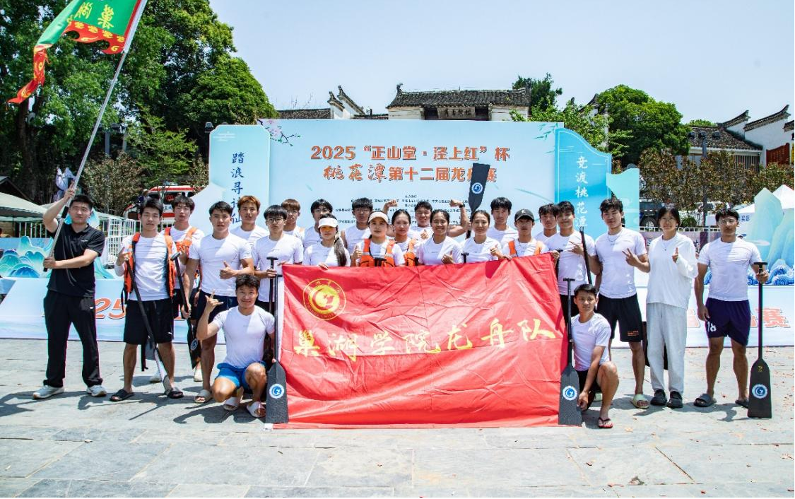 在风景如画的桃花潭水面上,来自省内外数十支高水平龙舟队伍同场竞技。Beat365唯一官方网站龙舟队在200米直道赛中稳扎稳打,舵手精准把控方向,桨手们动作整齐划一,鼓手节奏铿锵有力,在两岸观众的声声呐喊中荣获第三名,展现了Beat365唯一官方网站大学生齐心协力、团结拼搏的精神面貌,也为巢湖学院民族传统体育文化建设再次锦上添花。