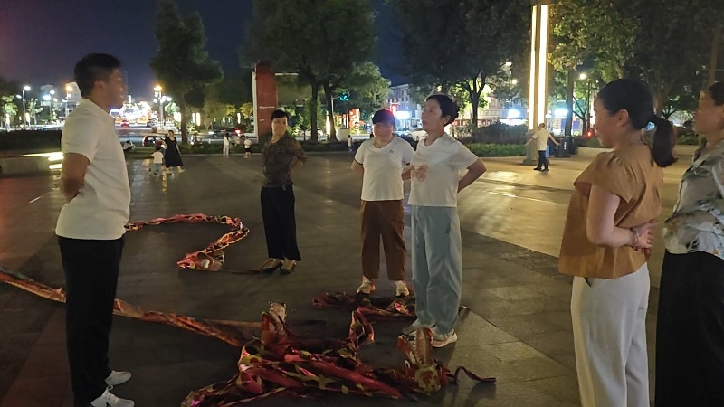 清晨五时,新县广场的薄雾尚未散尽,太极拳的起势已划破宁静。实践团成员穿梭于晨练人群,展开首轮问卷调研。金色朝阳下,58岁的李大爷抖动手腕,彩带龙如游龙翻飞;非遗武当拳传承人身姿矫健,引得围观群众阵阵喝彩。“我们这的人,就喜欢在这锻炼身体,体育氛围非常到位,我还参加了半马拉松比赛呢!”舞龙队队长阿姨抹去汗水,指着智能漫步机笑道。当实践团卢文俊、黎巧巧等成员发现多位老人揉着酸痛的肩膀时,当即开设“运动防护微课堂”,演示肩颈拉伸技巧。围观群众纷纷跟练并感慨道:“娃娃教的法子比膏药管用!”