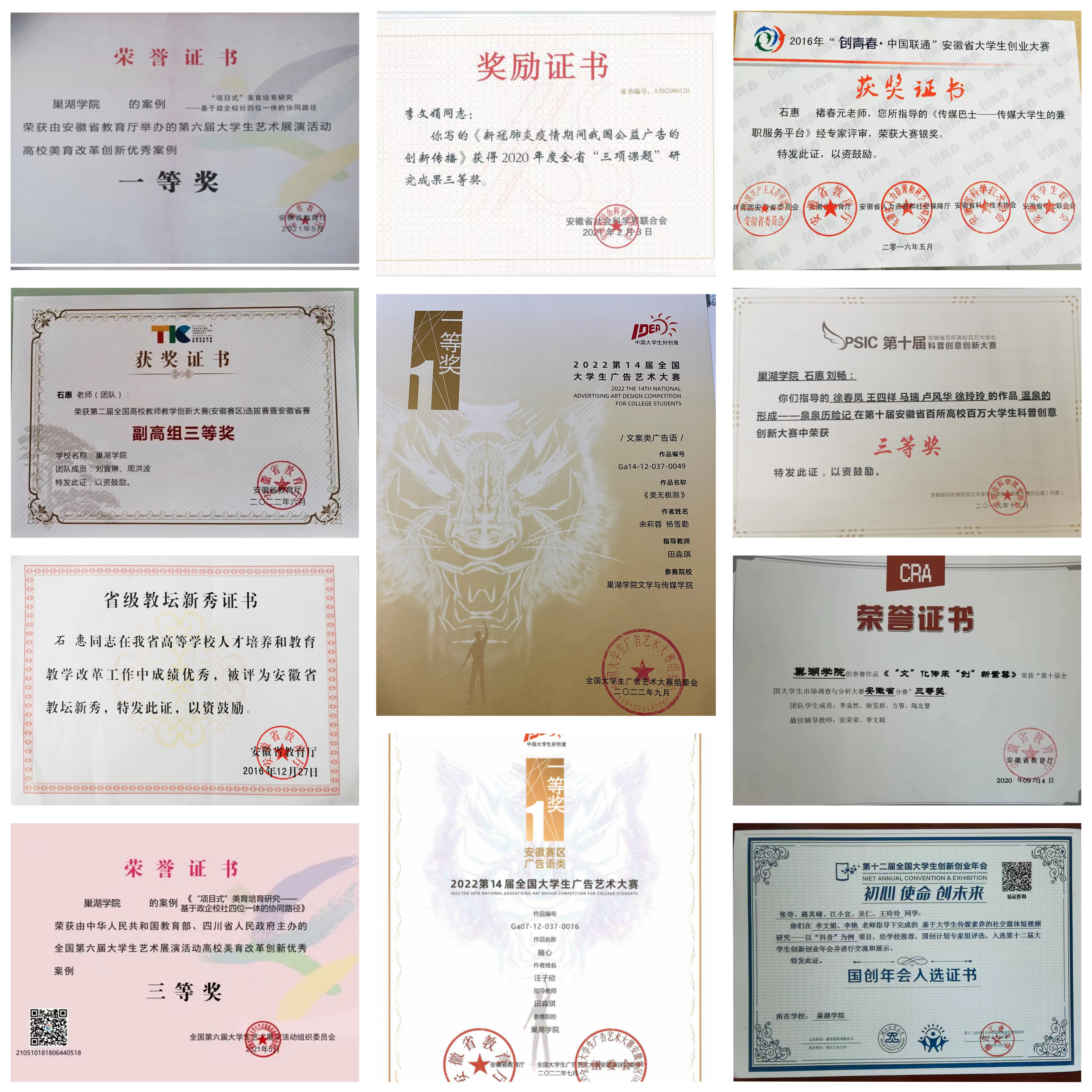 近几年教师指导学生获得全国大学生广告艺术大赛国家级38项、省级206项;全国图书馆杯设计大赛国家级一等奖;安徽省大学生艺术展演活动国家级三等奖、安徽省一等奖3项;“互联网+”青年红色筑梦之旅安徽省银奖;安徽省乡村振兴大赛6项;省级大学生质量文化与品牌创意大赛19项;安徽省大学生创业大赛银奖2项、安徽省双百大赛等省级三等奖3项、二等奖2项等荣誉。国家级省级大学生创新创业项目30余项,皖维集团孵化基金项目15项等,作品成果被学习强国、央视新闻、中国文明网、安徽网、政府公众号报道。