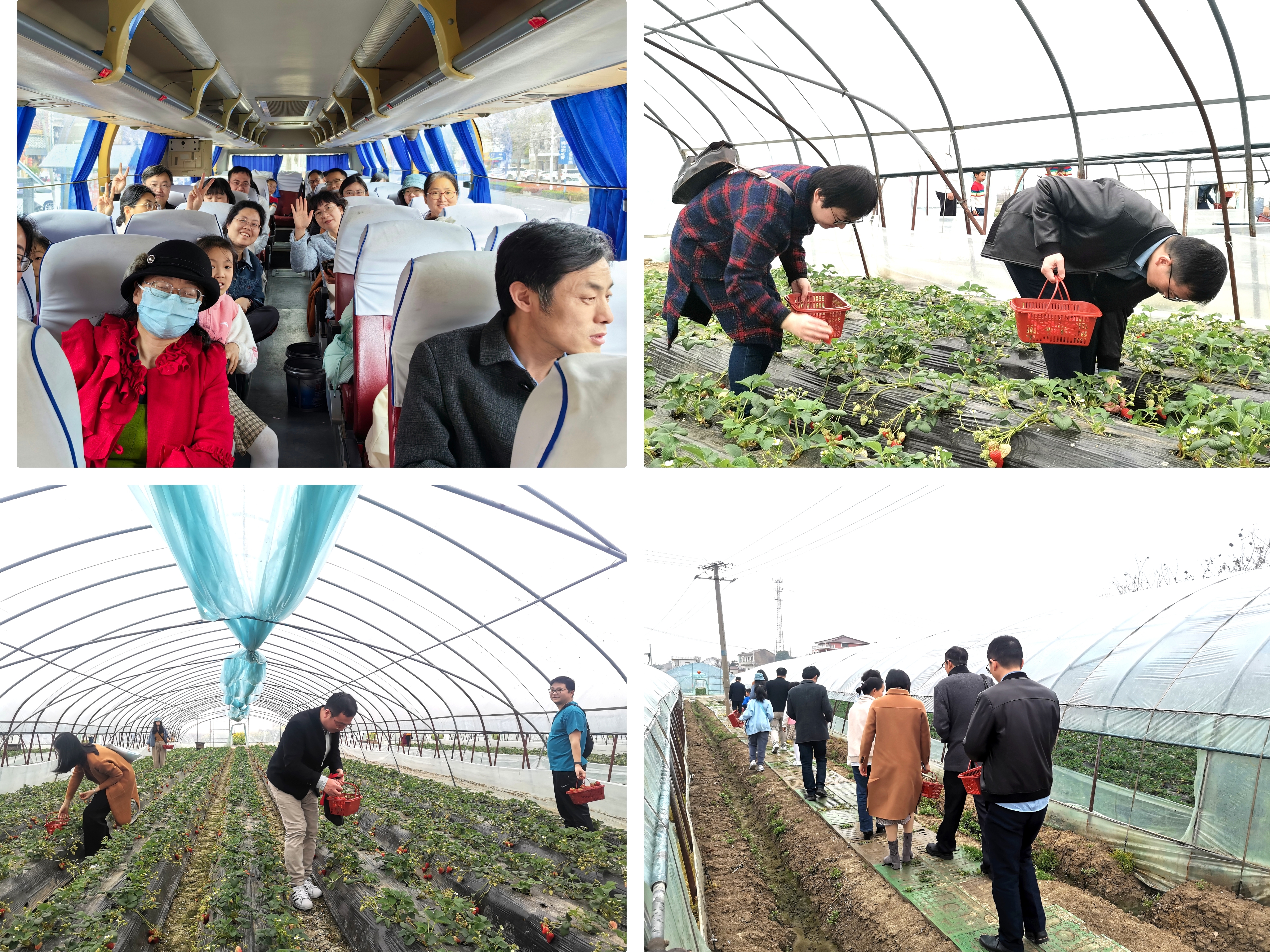 在欢声笑语中,文传学院教职工一齐登上开往春天的大巴,经过约一个小时的车程,大家顺利来到草莓采摘园。一下车,迎面扑来的是和煦微风送来的阵阵草莓果香,让人沉醉。采摘园内,一垅垅草莓苗芊芊而立,整齐划一,沉甸甸的草莓果优雅低垂,令人垂涎欲滴,苗果红绿交织,相映成趣。大家争先恐后提着果篮直奔目标,三两成群穿梭在草莓棚之间,寻觅鲜红果实,一筐筐娇艳的鲜果与一张张明媚笑颜交相辉映,大家纷纷留下纪念影像,享受这惬意春光。