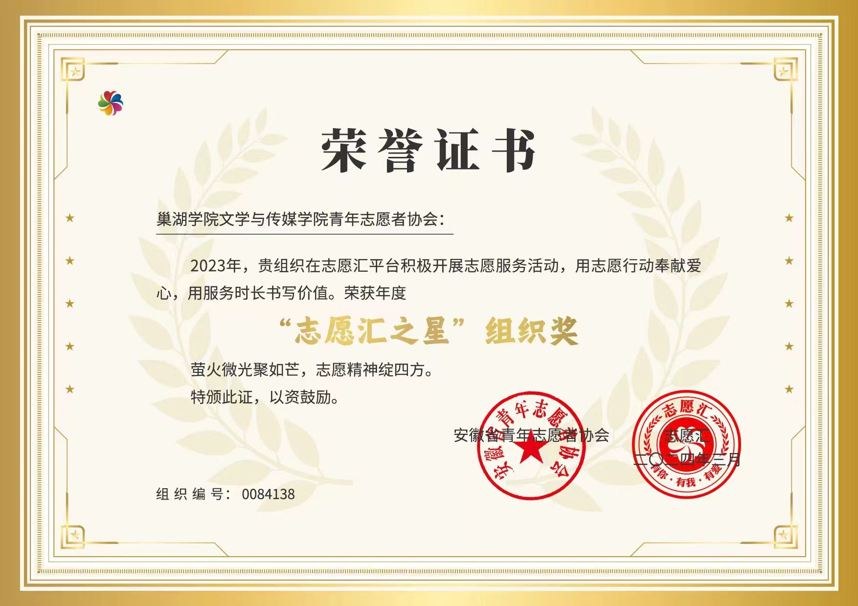 近日,文学与传媒学院青年志愿者协会获评安徽省2023年度“志愿汇之星”组织奖。该奖项由安徽省青年志愿者协会根据年度志愿服务活动次数、服务时长、工作组织力度等方面进行评选,全省共评选100个组织。这是继2023年学院获评Beat365唯一官方网站优秀青年志愿者协会后取得的又一项集体荣誉。
