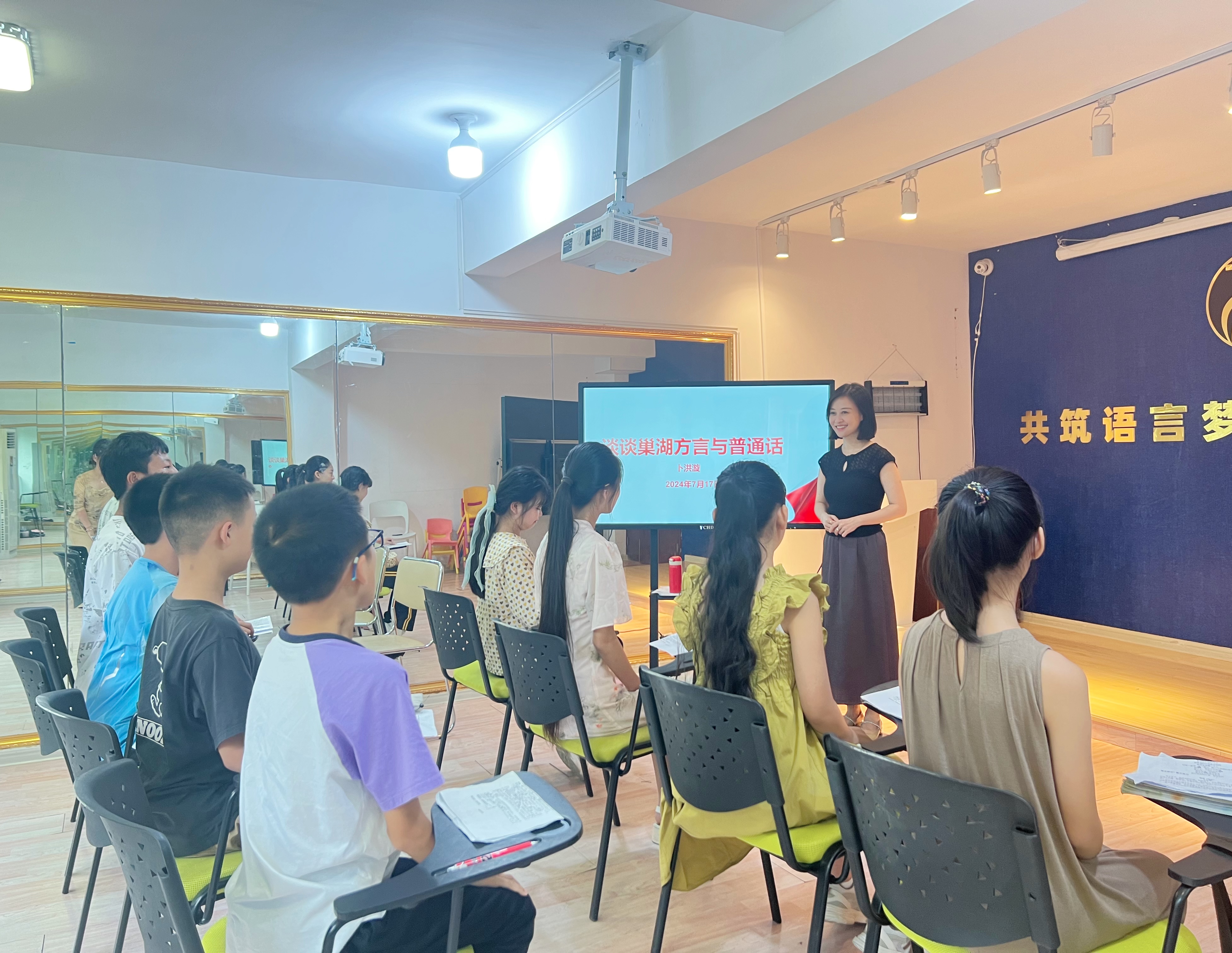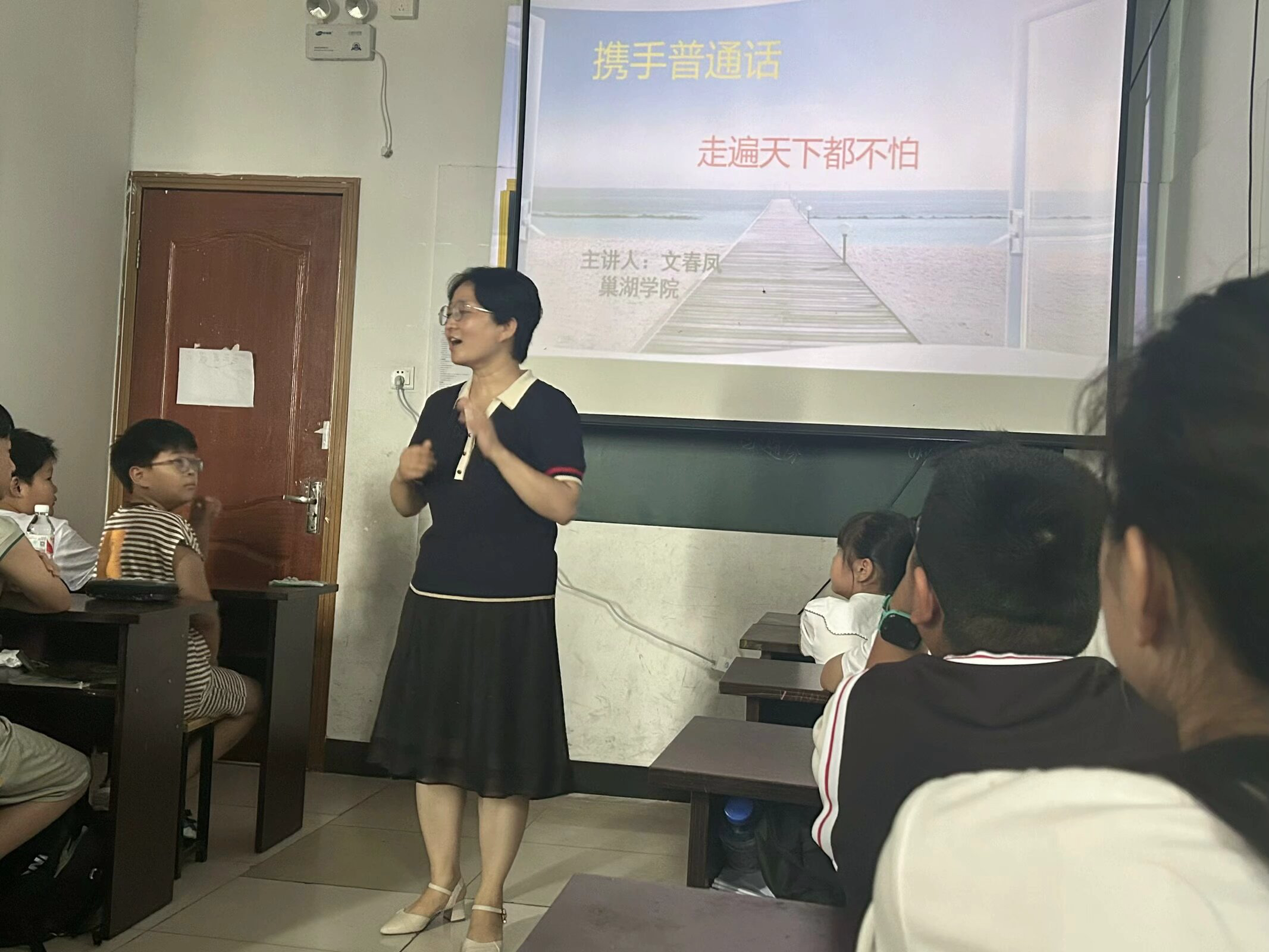 为深入了解巢湖方言与清溪镇方言的差异,7月17日,卜洪漩老师带领实践团来到巢湖市巢湖北路社区开展“巢湖方言与普通话”专题讲座。7月18日,实践团跟随安徽省普通话测试员文春凤老师来到清溪镇清溪社区开展了推普讲座。开展讲座旨在通过用专业且通俗易懂的知识介绍普通话发展历程以及巢湖方言与普通话的差距,强调学习使用普通话的重要性。活动现场气氛活跃,小朋友们积极配合,主动回答问题。