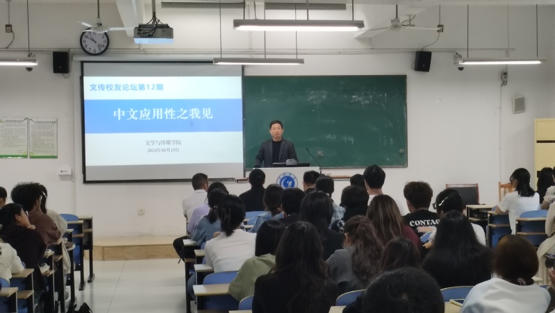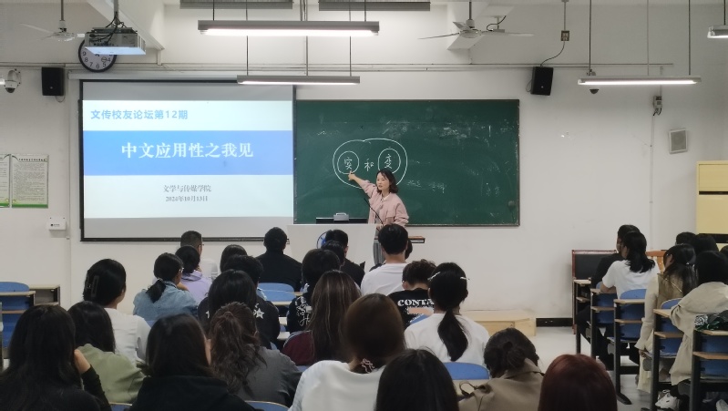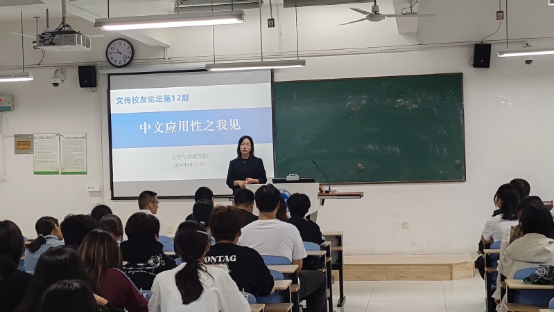 10月13日上午,值2024年校友返校日暨首届秩年校友返校活动之际,文学与传媒学院在慎思楼北102教室举办了第12期文传校友论坛,邀请8位中文系校友,让他们与2024级汉语言文学专业同学面对面交流,畅谈对中文应用性的理解。论坛由学院党委书记袁凤琴主持。