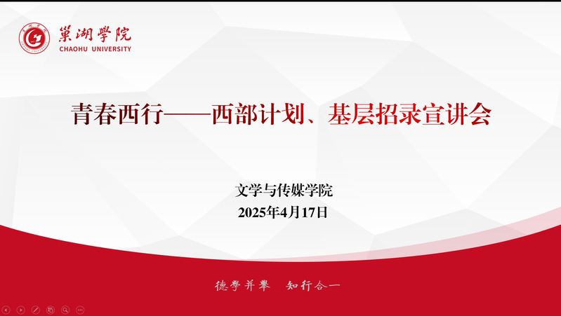 为响应国家号召,引导青年学子投身基层、服务西部,4月17日晚,文学与传媒学院举办“青春西行——西部计划、基层招录宣讲会”。学院毕业班辅导员、就业联络员和部分2025届毕业生参加线上会议。会议由学院党委副书记孙冰主持。