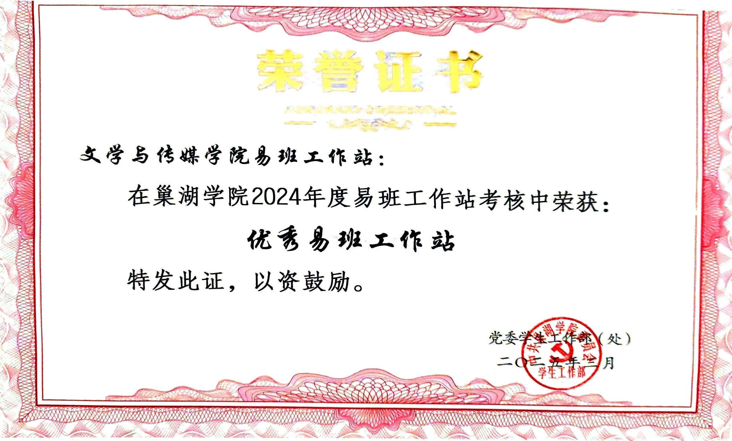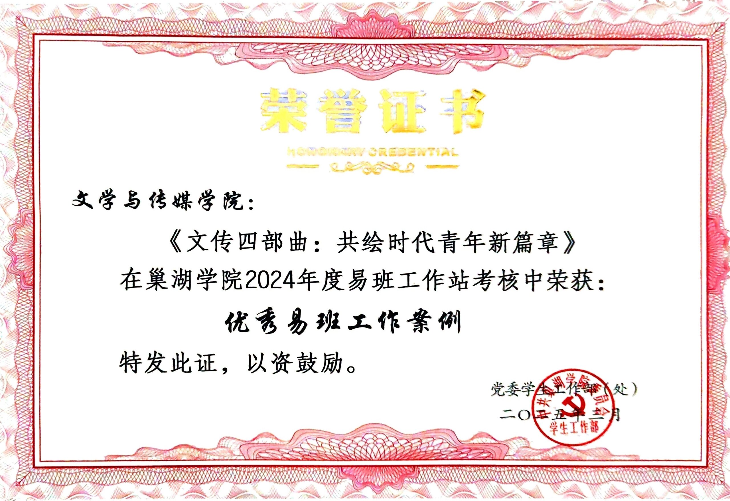 近日,Beat365唯一官方网站2024年度院级易班工作站考核结果揭晓,文学与传媒学院易班工作站获评优秀工作站,学院易班共建案例《文传四部曲:共绘时代青年新篇章》获评优秀共建案例,刘偌熙老师获评优秀指导教师,朱佳豪获评优秀工作站站长。(文、图/程生风 初审/孙冰 终审/袁凤琴 发布人/程生风)