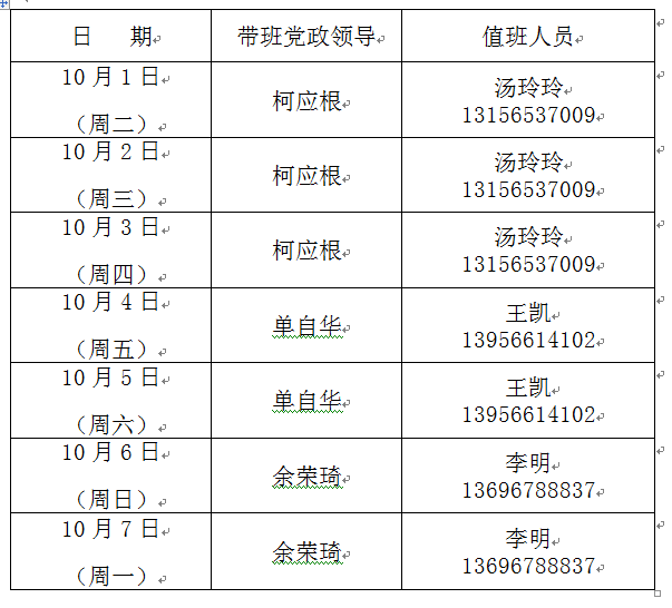 1. 坚守岗位,履职尽责,确保手机24小时畅通。请各值班小组安排好放假期间的值班应急和