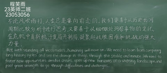 比赛过程中,参加硬笔书法的同学们握笔准确,坐姿端正,作品内容笔画流畅,结构匀称,整齐美观。参加粉笔字的同学们全神贯注地在黑板上挥洒书写豪情,运笔和结构形神俱佳。参加毛笔字的同学们手持毛笔,恣意挥洒,作品表现了不同时代背景下的书法艺术发展和创新之道。