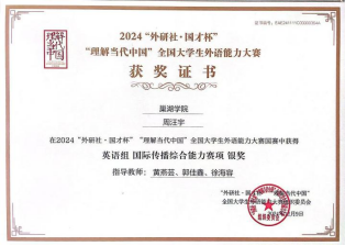 “语言是沟通世界的桥梁,更是讲好中国故事的钥匙。”他始终以这样的信念鞭策自己。作为英语专业学生,他连续两年斩获“外研社·国才杯”全国大学生外语能力大赛国家级奖项,其中2024年更以出色的成绩荣获全国二等奖。在CATTI杯翻译大赛、安徽省跨文化能力大赛等赛事中,他以精准的语言表达屡获佳绩,展现了“用英语传递中国声音”的专业担当。