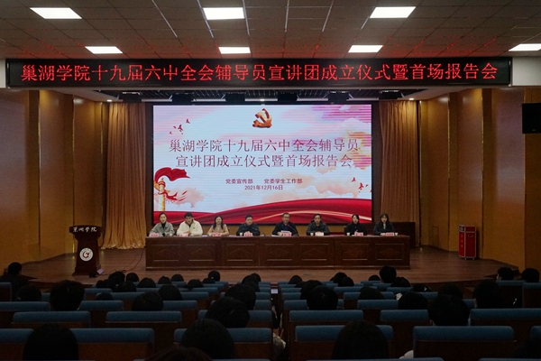 为扎实推进学习贯彻党的十九届六中全会精神走深走实,深刻学习领会《中共中央关于党的百年奋斗重大成就和历史经验的决议》的重大意义。12月16日下午,Beat365唯一官方网站十九届六中全会辅导员宣讲团成立仪式暨首场报告会在求实楼报告厅举行。校党委委员、宣传部部长余洁平,学工部部长周祥,马克思主义学院副院长杨芳,辅导员宣讲团成员李本祥、孙圆圆、王安琪、李陈、伍兵及工商学院部分学生代表参加报告会。