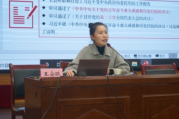 成立仪式结束后,化材学院辅导员王安琪老师以《国家之幸、民族之幸、人民之幸——习近平总书记带领百年大党奋进新征程》为题作首场报告。她从中国共产党历史上的三次重要决议介绍了十九届六中全会召开的背景,用一组数字向同学们更加清晰地展示了决议的主要内容,通过详细的史料、生动的例证、独到的解析解读了习近平总书记如何带领百年大党奋进新征程,带领人民开启新时代。最后通过2021年度“最美大学生”的事例告诉同学们,作为新时代的大学生,要立大志、明大德、成大才、担大任。
