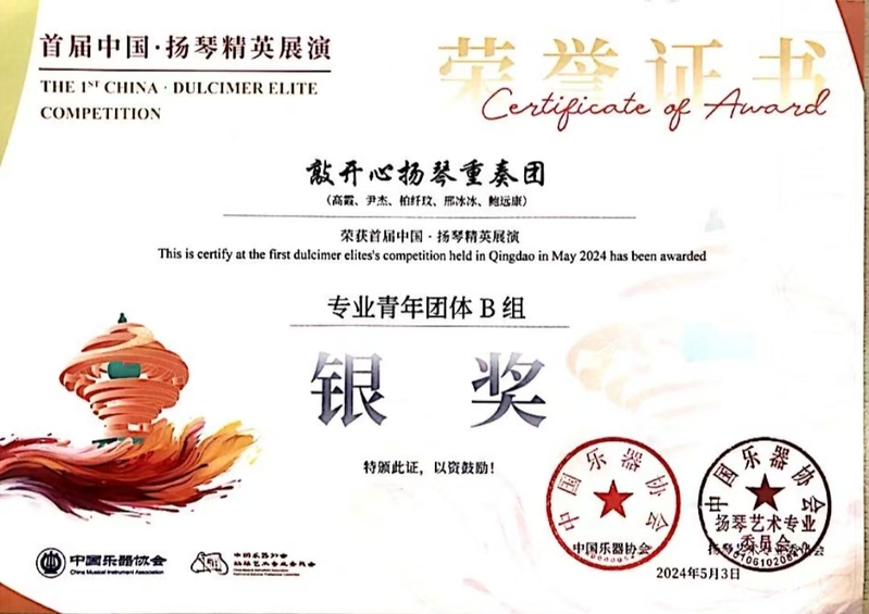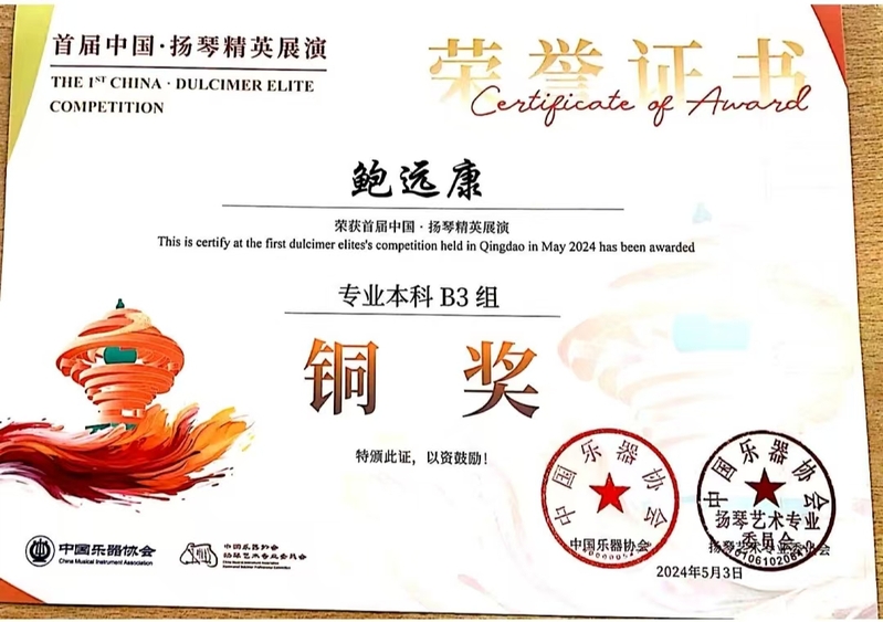 5月初,“首届中国·扬琴精英展演开幕式暨世界扬琴文化巡礼专场音乐会”在青岛举行。本次展演前期设扬琴团体和个人比赛环节,吸引了全国约400名学生积极参与。经过线上初赛、线下复赛和决赛的严格筛选,教师教育学院音乐表演专业的“敲开心”扬琴重奏团荣获专业组团体银奖(指导教师:王佩琦、周雨茜),2023级音表专业的鲍远康同学(指导教师:周雨茜、王佩琦)获独奏专业组铜奖。