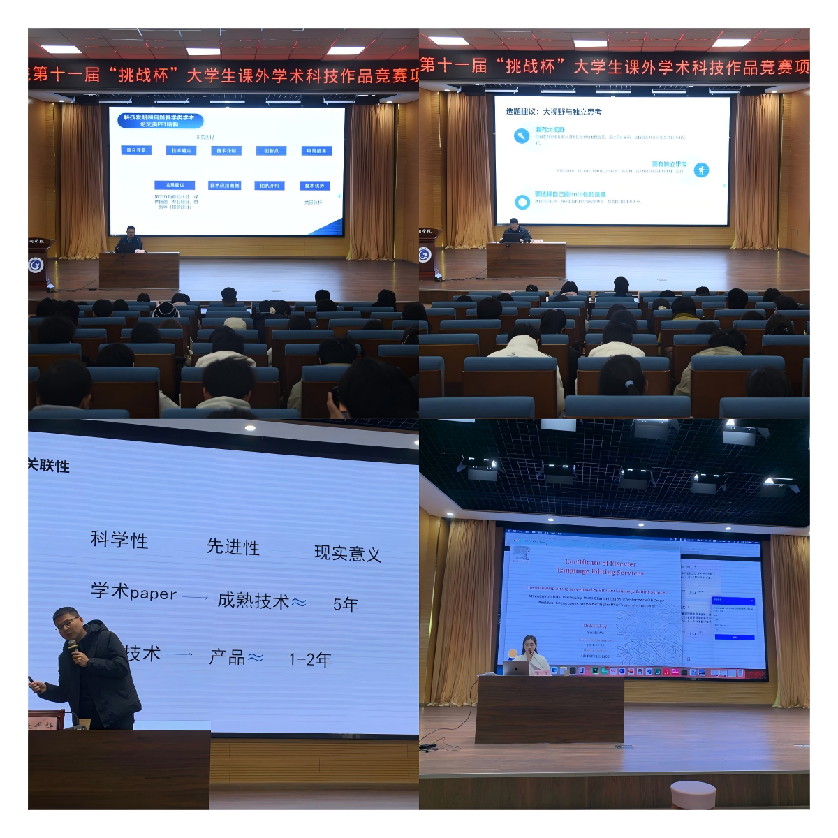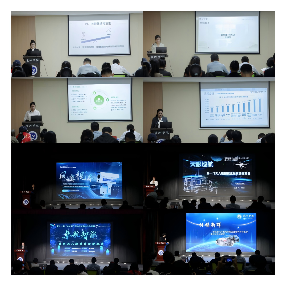 本次大赛以“崇尚科学、追求真知、勤奋学习、锐意创新、迎接挑战”为宗旨,参赛作品分为自然科学类学术论文、哲学社会科学类社会调查报告、科技发明制作三大类,理科组作品涵盖机械与控制、信息技术、生命科学等领域,文科组作品聚焦中国之治、发展成就、文明文化等哲学社会科学议题。决赛现场,理科组选手重点围绕项目背景、产品创新、技术原理、支撑材料等内容进行展示汇报,他们在无人机智能巡检、病虫害数智化诊断、新能源汽车制动系统密封材料等方面实现了技术突破和创新;文科组选手基于徽州区古建筑保护、傩戏和巢湖民歌等非遗文化的传承、天价彩礼治理、老漂族社会融入等议题的实地调研,从调查背景、调查方法、调查结论以及建议对策等方面展开汇报。参赛选手们的精彩表现充分展现了我校学子敏锐把握社会需求、创造性解决实际问题的能力。经过激烈角逐,本次大赛择优遴选文科和理科组共22件作品进入省赛打磨环节,最终拟推荐18件优秀作品参加省赛。
