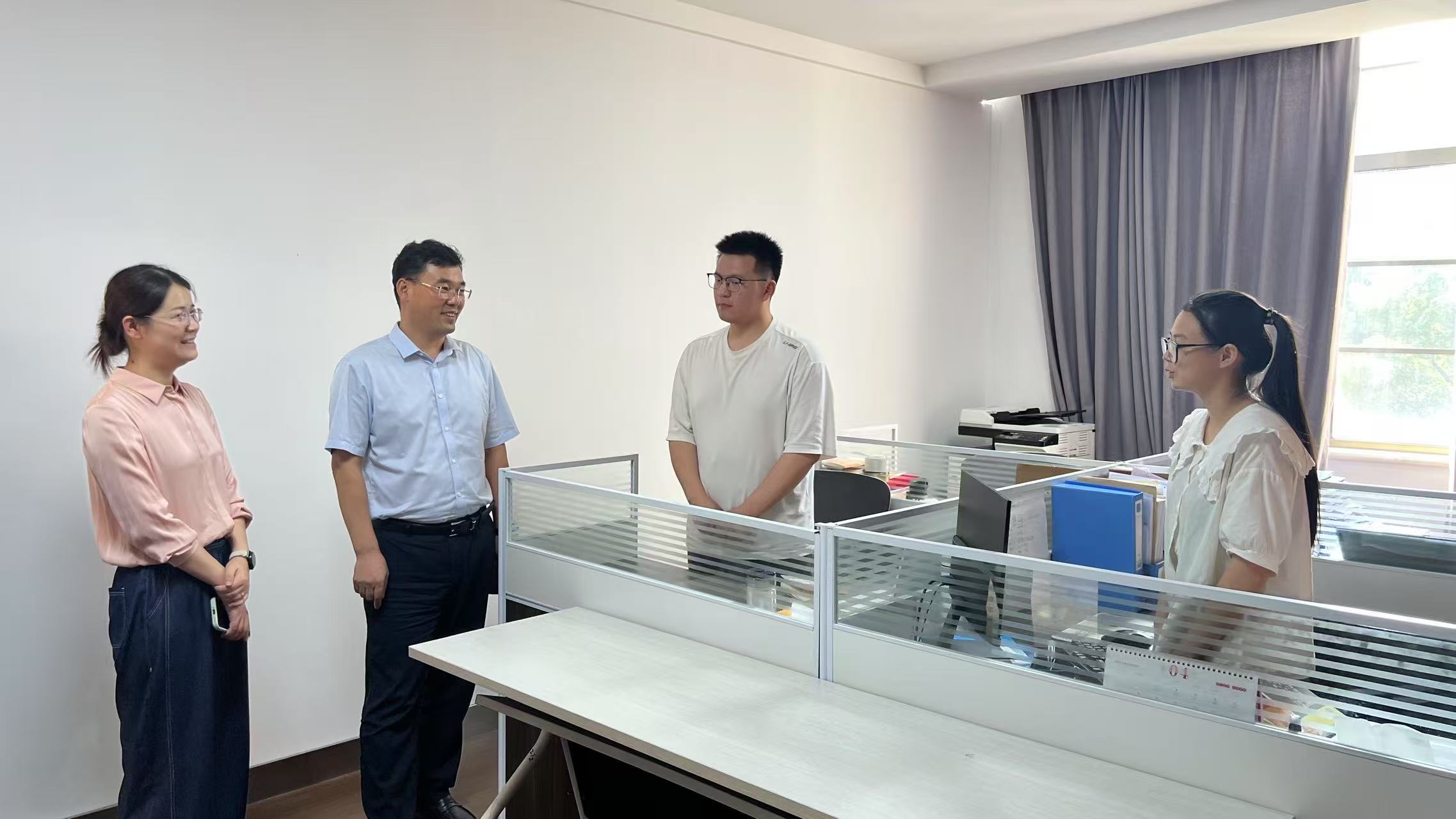 在巢湖市,宋立敏一行来到团巢湖市委,与挂职学生骨干文海、刘慧敏深入交流,细致询问日常工作内容、留校生活保障等情况。两位同学表示,此次挂职是一次难得的成长历练,在参与青少年活动策划组织、团属新媒体平台运营及基础团务管理等工作中,不仅积累了宝贵的基层工作经验,更搭建起深入了解地方发展的实践桥梁,个人实践能力与综合素养得到有效提升。宋立敏对同学们主动报名参与挂职的担当精神给予高度认可,肯定了他们的工作成效,并勉励大家珍惜机会,做到“多看、多干、多学”——多看地方治理机制与发展实际,多干具体事务积累实践经验,多向基层干部群众虚心求教,努力将所学知识转化为服务地方发展的实干本领。