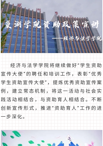 一次大使代言。经济与法学学院选聘国家奖学金、励志奖学金获助学生为资助“大使”,开展“倾心助学 倾力筑梦 大使有话说”国家资助政策线上主题宣讲,“大使”们以自身成长历程为例,对生源地助学贷款政策、近几年国家和学校的资助总览进行详细介绍,旨在进一步宣传国家资助政策及其成效,助力广大学子圆梦未来。