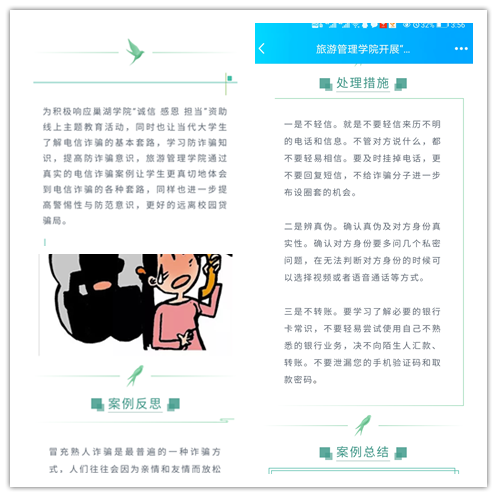 一次案例征集。旅游管理学院、电子工程学院等学院聚焦大学生防范电信网络诈骗、套路贷等方面的实践案例,开展“防骗有术 理性消费”案例征集,参赛学生以鲜活的案例演绎常见诈骗活动的发生过程,分享学习生活中常见的防骗技巧,并提醒广大学生要远离套路贷,理性消费。