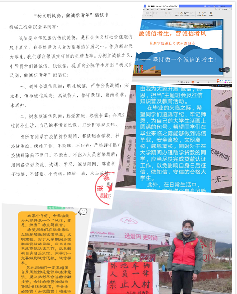 一场主题班会。以疫情防控背景下的理想信念教育、社会责任感教育、诚信教育为主要内容,结合“云”考试、毕业论文(设计)等工作,开展全年级线上主题班会,引导学生成为诚信的践行者、示范者和监督者,活动覆盖所有在校生。