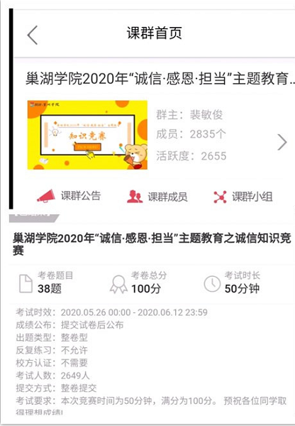 一次知识竞赛。利用“易班·今日校园”平台,围绕诚信教育、征信知识、防“套路贷”等内容设置题目,面向全体受助学生开展“诚信 感恩 担当”主题教育之诚信知识竞赛。活动共吸引2835名学生参与,覆盖全体生源地助学贷款学生,占非毕业班受助学生的93%,共评选获奖学生12人。