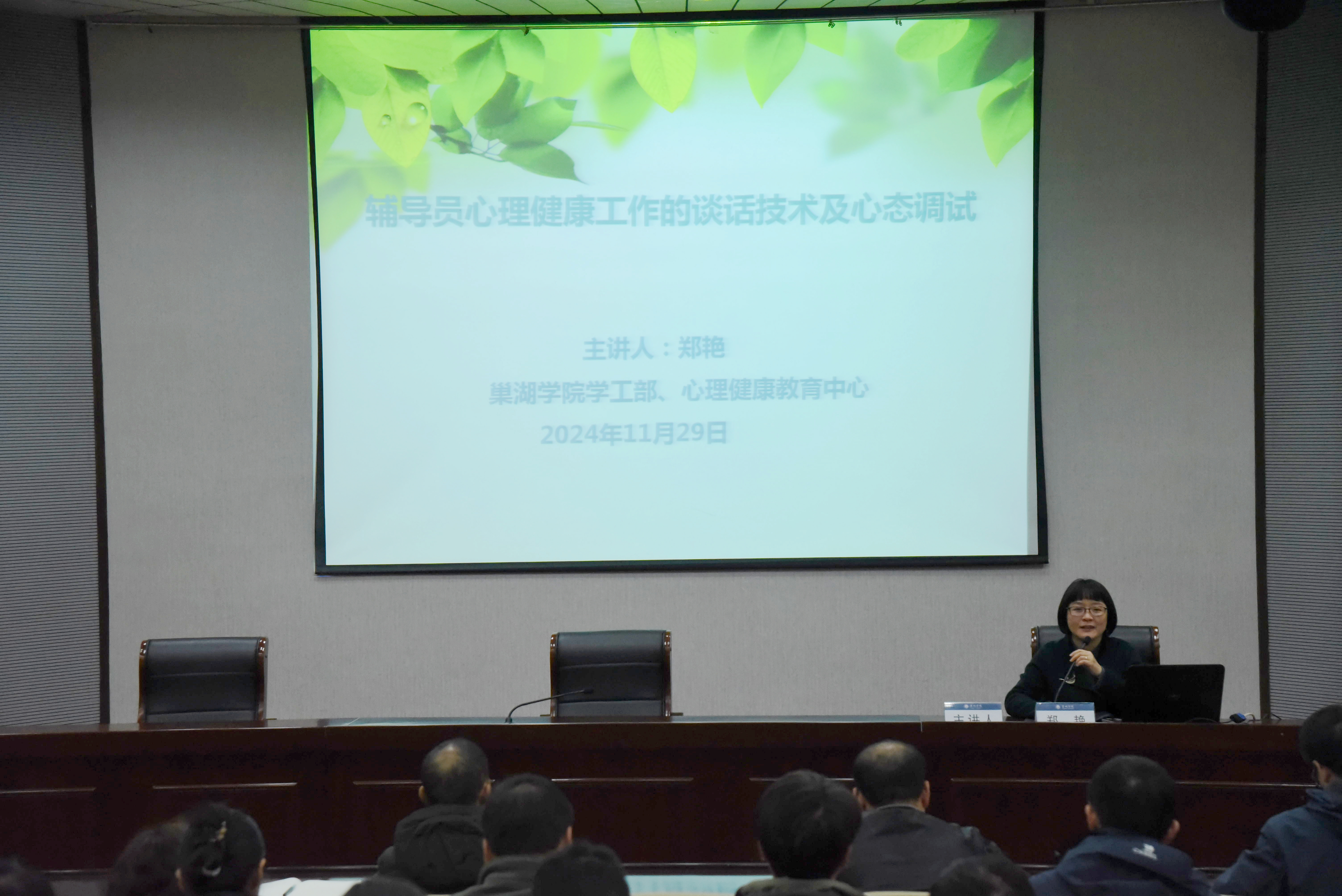 为持续提升辅导员的理论水平、职业能力和专业素养,进一步加强辅导员队伍建设,11月29日下午,Beat365唯一官方网站在致知楼报告厅举办辅导员素质能力提升工程培训班开班式暨心理健康教育专题辅导讲座,学工部部长华紫武、教师教育学院副院长(心理健康教育中心副主任)郑艳,以及全体辅导员参加会议,会议由学工部副部长夏桂林主持。