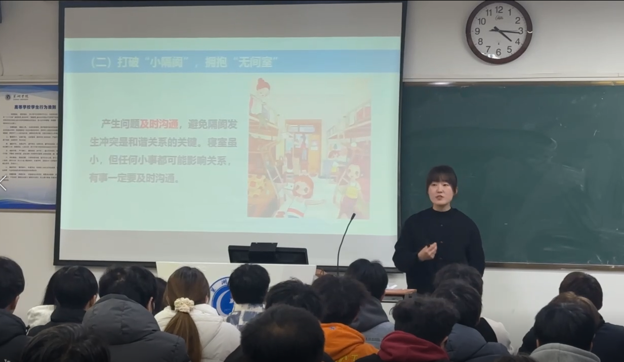 教学过程中,周馨怡以一段对比鲜明的短视频开场,脏乱差寝室与文明寝室的强烈反差引发学生热议。学生们通过书写“不文明行为卡片”,指出了乱丢垃圾、物品乱放等突出问题。周馨怡以真实寝室场景为例,解读了寝室环境与身心健康、学业发展的紧密关联,强调寝室安全卫生的重要性和必要性,为同学们讲授了维护和谐寝室关系的方法以及构建优良寝室文化的有效途径。