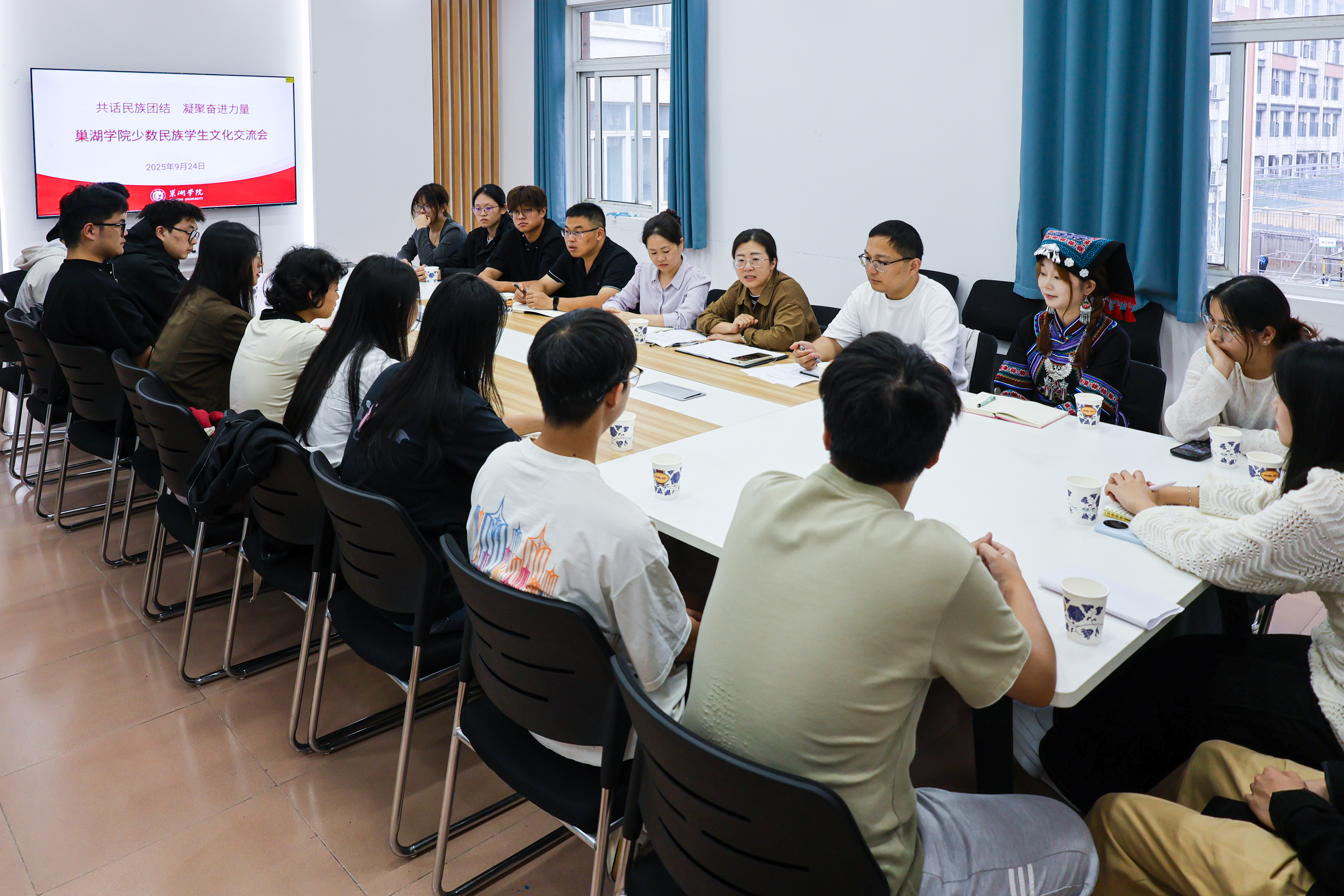 为深入学习贯彻习近平总书记关于加强和改进民族工作的重要思想,加强党和国家的民族政策宣传教育和民族文化交流,了解学校少数民族学生的学习生活状况与思想动态,倾听学生心声,回应学生关切,9月24日,学校于汤山苑“巢有范”学生社区召开“共话民族团结 凝聚奋进力量”少数民族学生文化交流会。党委学工部副部长金晶、宣传部副部长朱春花、工商管理学院党委副书记何冬冬和少数民族学生代表参加了此次交流活动。