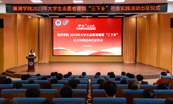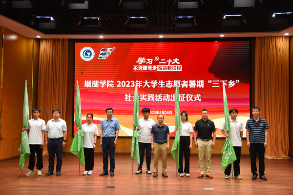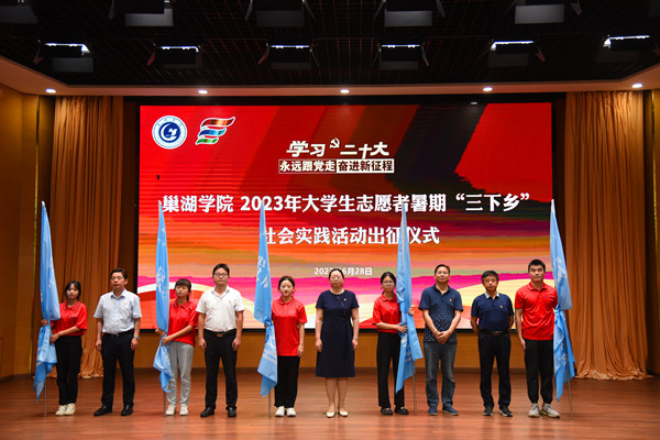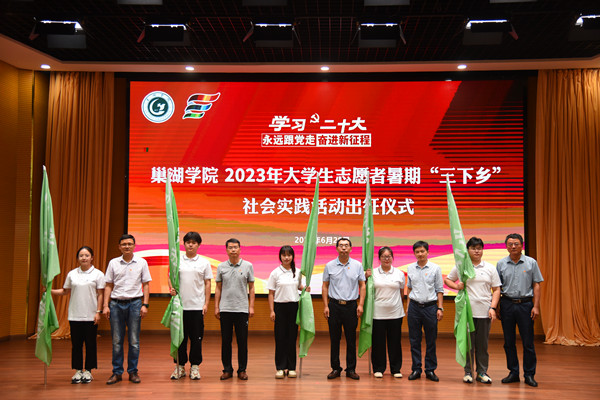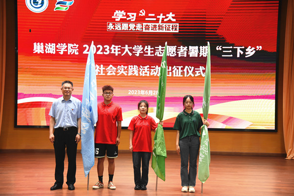 周峰在讲话中指出,大学生暑期“三下乡”社会实践活动是落实习近平总书记关于青年工作的重要思想的具体举措,是加强和改进高校思想政治教育、深化爱国主义和新时代劳动教育的重要途径,是大学生拓展视野、认知国情、增长才干、服务社会、砥砺品格的有效载体。一直以来,学校高度重视,始终把社会实践作为立德树人的重要内容来谋划,作为大学生全面发展的关键环节去推进。为了让这场“行走的思政课”更加有“知”有“味”,他代表学校党委向即将奔赴各地参加社会实践的全体师生提出四点要求:一是要虚心学习,在社会大课堂中涵养真挚的“为民情怀”。实践师生要深入基层,深入生活、深入民众,走进寻常百姓家,用心学习、走心服务,用好“三下乡”社会实践这个检验真知、磨砺意志、提升本领的“磨刀石”,厚植对祖国血浓于水、与人民同呼吸共命运的真挚情感;二是要矢志奋斗,在乡村大舞台上涵养“自找苦吃”的精气神。实践师生应牢记习近平总书记的殷殷嘱托,把自己的人生追求同国家发展进步、人民伟大实践紧密结合起来,沉下心、扑下身,在“自找苦吃”的过程中迎难而上、不断奋进,在乡村振兴一线书写青春担当,收获成功“甘甜”;三是要善作善成,在人生最美的青春时光中涵养创新精神。实践师生要立足专业特长,创新方式方法,将社会实践与“互联网+”“挑战杯”“大学生艺术展演”等竞赛,与教科研、学科专业建设、社会经济发展、社会公益、“青马工程”培训等项目相结合,敢于解放思想、与时俱进,勇于上下求索、开拓进取,更加精准、更有针对性地开展实践活动,塑造创新品质,彰显巢院特色;四是要强化风险防范意识,坚持安全第一的原则,严守纪律,服从指挥,确保实践活动安全有序开展。