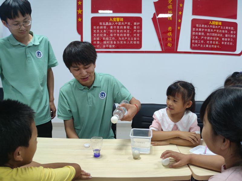 知识改变命运,科技繁荣祖国。7月7日,实践团队向小朋友进行科学小实验演示和原理解释,带领小朋友近距离探索科学的奥秘。吴传智小朋友在实践团队的帮助下,完成了蜡烛燃烧引得空瓶水位上升的小实验。通过实验小朋友了解到压力、浮力等知识。过程中,小朋友们聚精会神、踊跃回答,领略科技的魅力,这一活动促进了小朋友们积极培养对科技的兴趣。